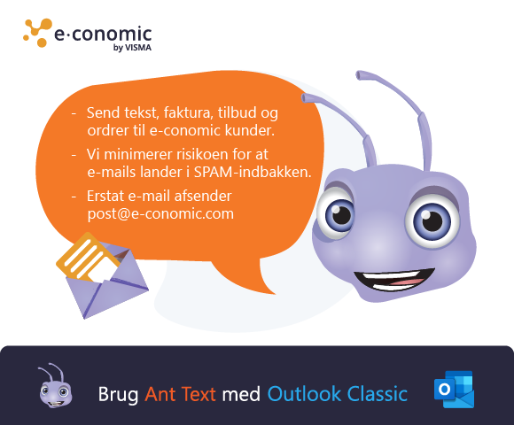 Erstat post@e-conomic.com med din firma e-mailadresse som afsender og send fakturaer, ordrer og tilbud med e-mail skabeloner. Vedhæft ekstra filer, og gem alt i din send post for overblik. Ant Text fletter med e-conomics dynamiske felter direkte i dine Outlook e-mails. Liste over e-conomic flettefelter kan du se her: https://www.anttext.com/support/economic-felter/. Ant XL funktion er et perfekt værktøj til masseudsendelse af e-mails som fx rykkere, nyhedsbreve, opfølgningsmails, produktnyheder eller anden info til dine e-conomic kunder.