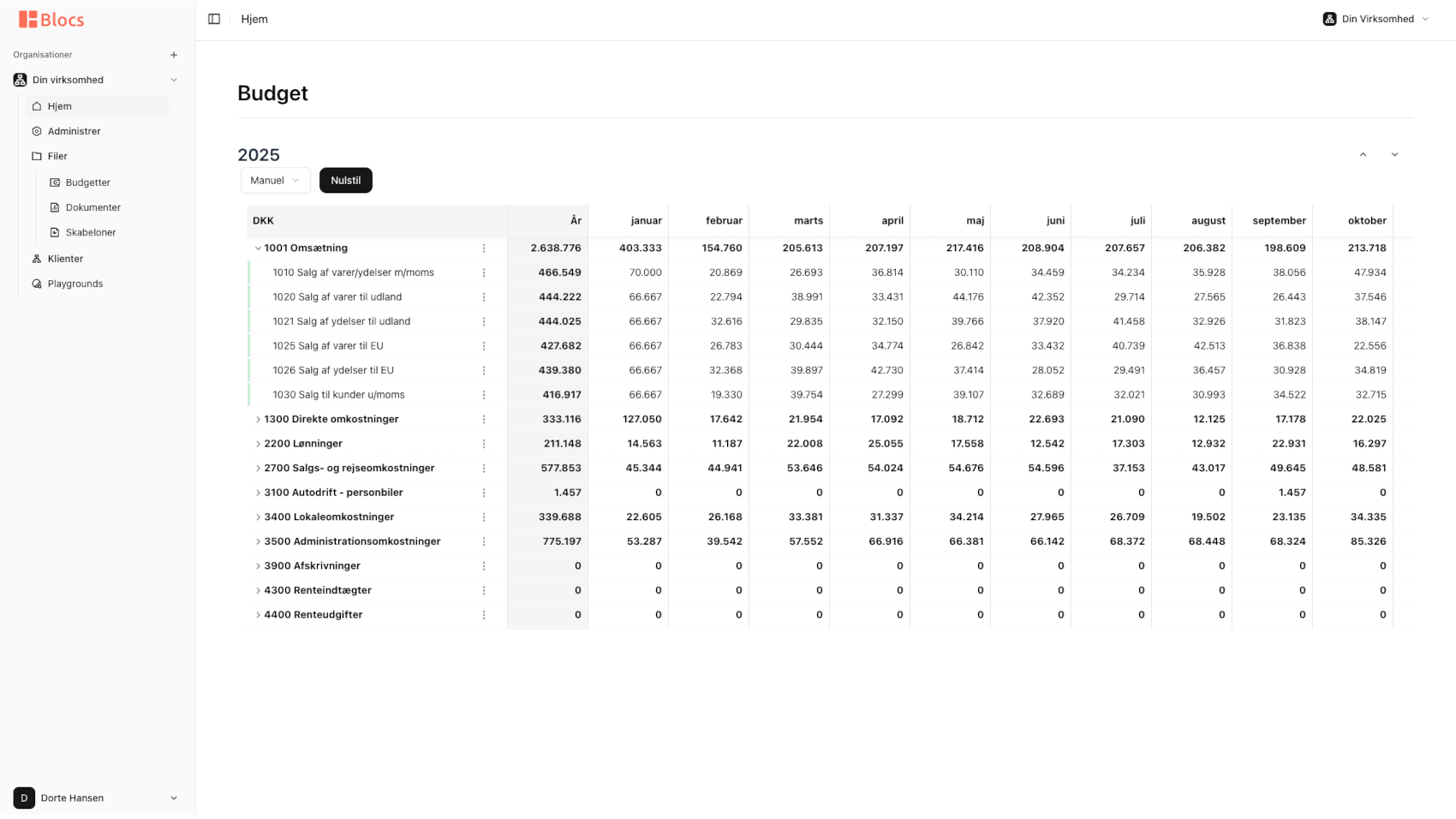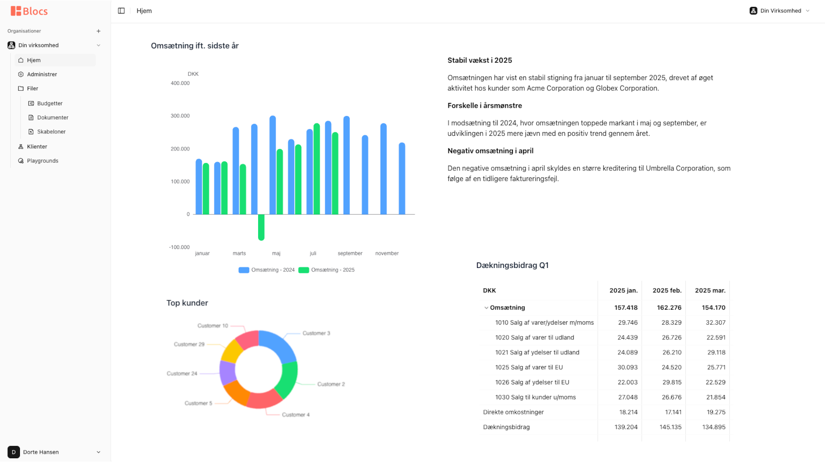Med Blocs får du en moderne platform til økonomistyring og rapportering. Blocs giver dig mulighed for at bygge dynamiske rapporter, så du kan analysere økonomien på tværs f.eks. kategorier, kunder, kundegrupper, og afdelinger.