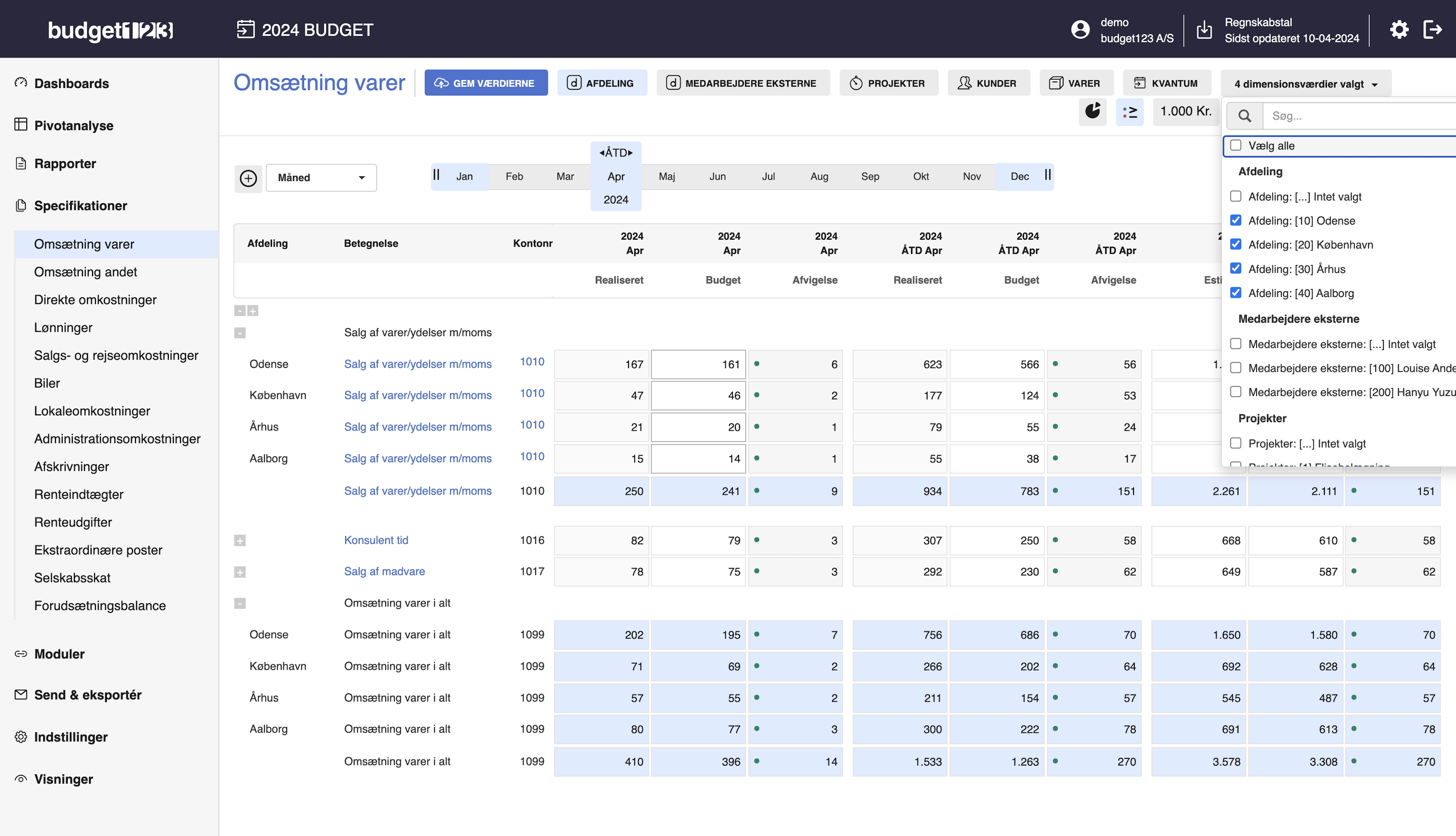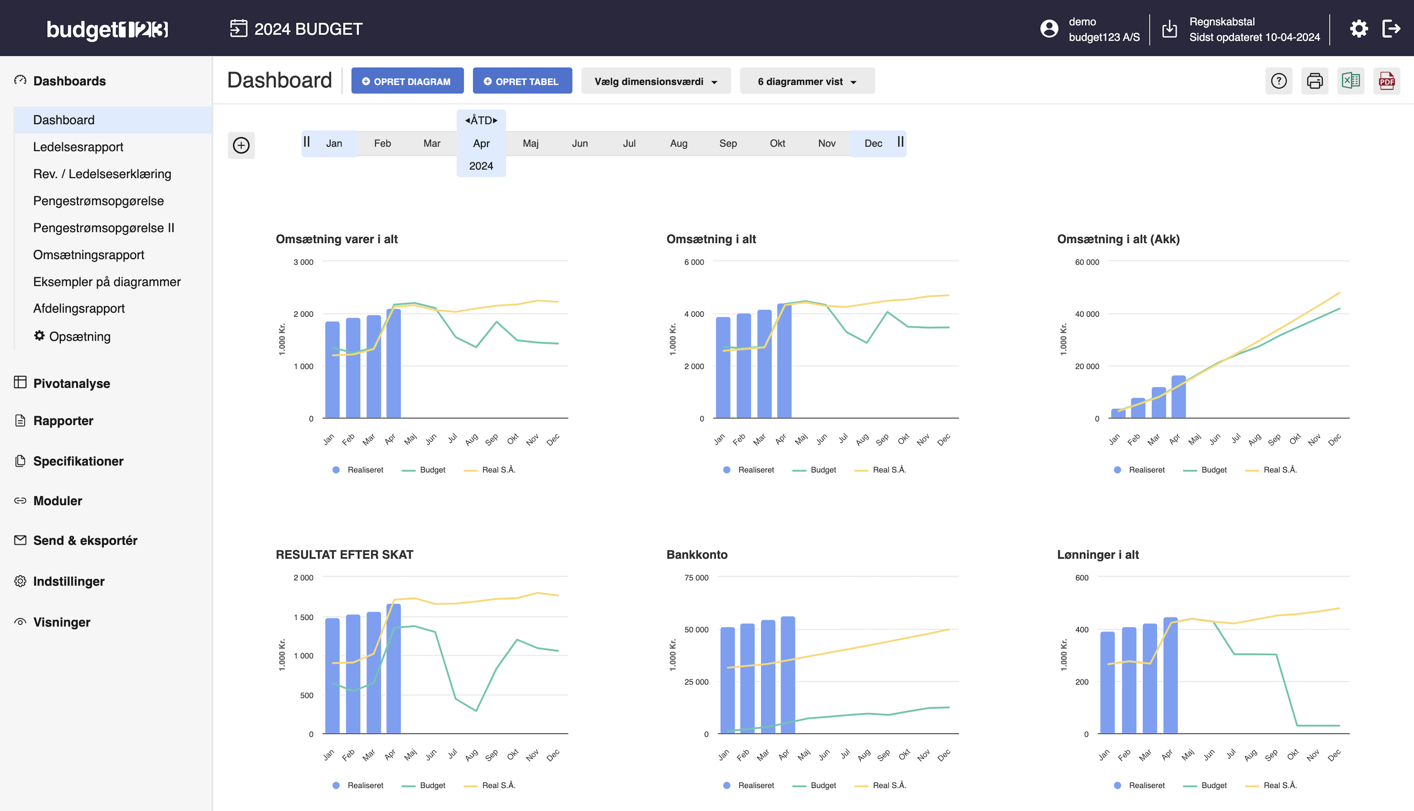Med budget123 kan du nemt generere overskuelige rapporter og budgetter ud fra dine bogførte tal. Og du kan tilpasse dine rapporter og budgetter ud fra de konti, afdelinger, dimensioner og perioder, du ønsker. Dermed kan du lave relevante drifts-, balance- og likviditetsbudgetter samt rapporter for din virksomhed. Du kan også lave pålidelige forecasts ud fra dine bogførte tal. Så kan du hurtigt se, hvordan tallene påvirker det forventede årsresultat og spotte fremtidens muligheder og faldgruber. Samtidig får du visualiseringer af virksomhedens data i flotte diagrammer og grafer. På den måde kan du præsentere økonomiske data for ledelse, bestyrelse og bank på en professionel måde. Du får en ubesværet integration mellem e-conomic og budget123, hvor du bruger det samme login og nemt kan skifte frem og tilbage. Systemerne er desuden designet til at matche hinanden, så de er nemme at bruge sammen.