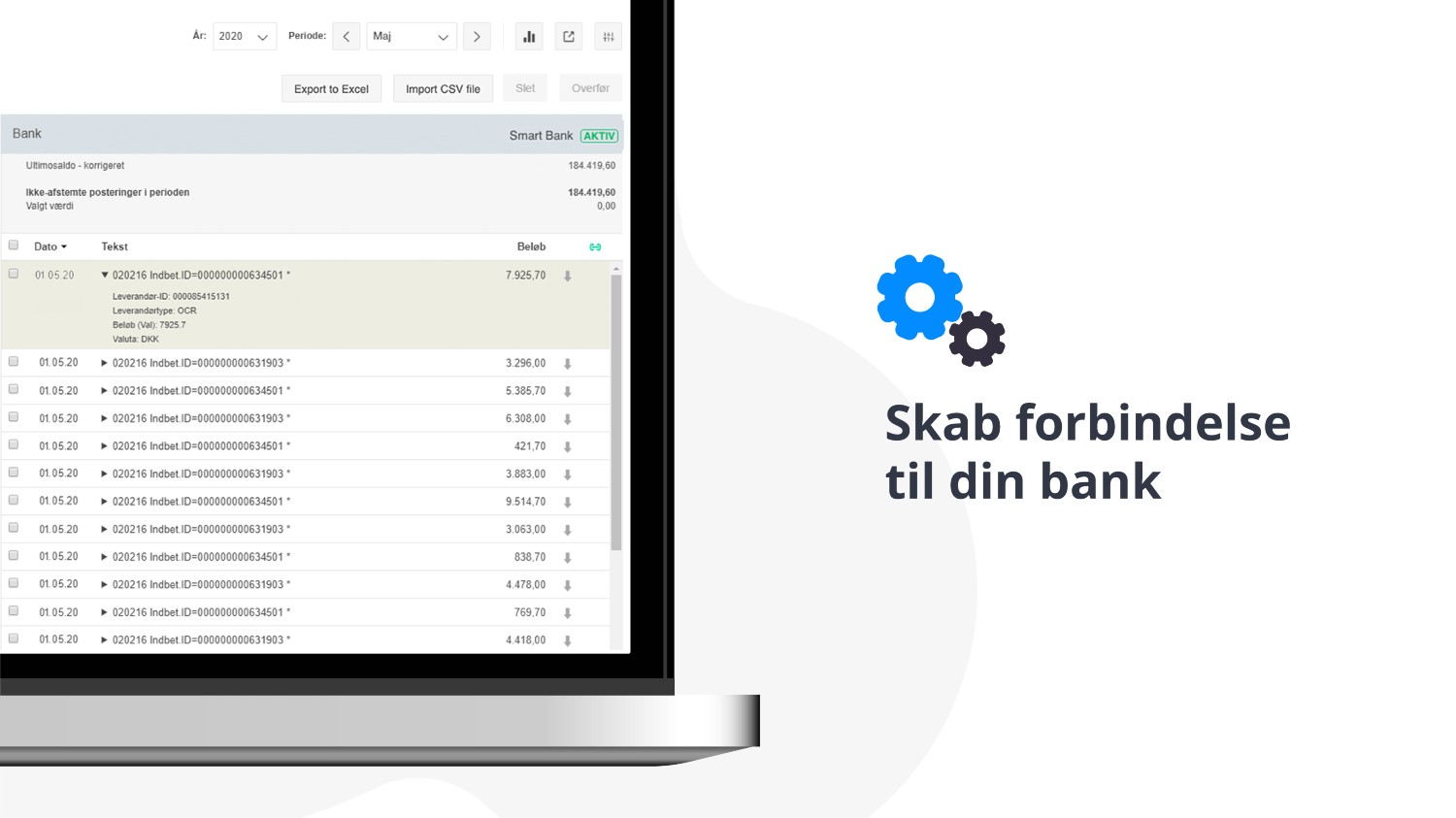 Med Smart Bank kan du få dine bankposteringer importeret til e-conomic automatisk, så du slipper for at printe kontoudtog og matche posteringer manuelt. Når dine bankposteringer er blevet importeret, kan du bruge funktionen Autoforslag til hurtigt at bogføre dem i din kassekladde. Autoforslag genkender alt fra finansbilag til kunde- og leverandørindbetalinger, og giver dig automatisk forslag til, hvordan de skal bogføres. Over tid lærer Autoforslag dit regnskab at kende og kommer derfor med mere og mere præcise forslag til kontering. Prisen for integrationen til din bank er inkluderet i modulet og udbydes i samarbejde med e-conomics partner, Nordic API gateway (Aiia).
