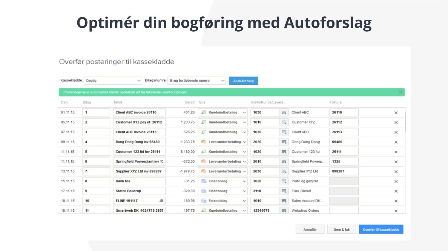 - Få forslag til din bogføring, baseret på tidligere handlinger
