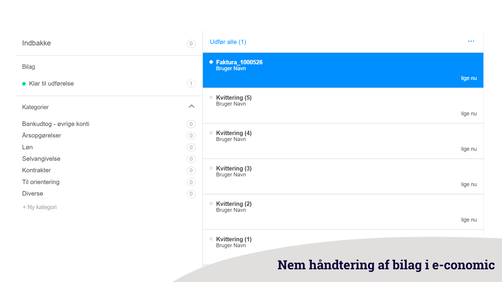 - Upload, godkend, kategorisér og kombinér bilag med ganske få klik