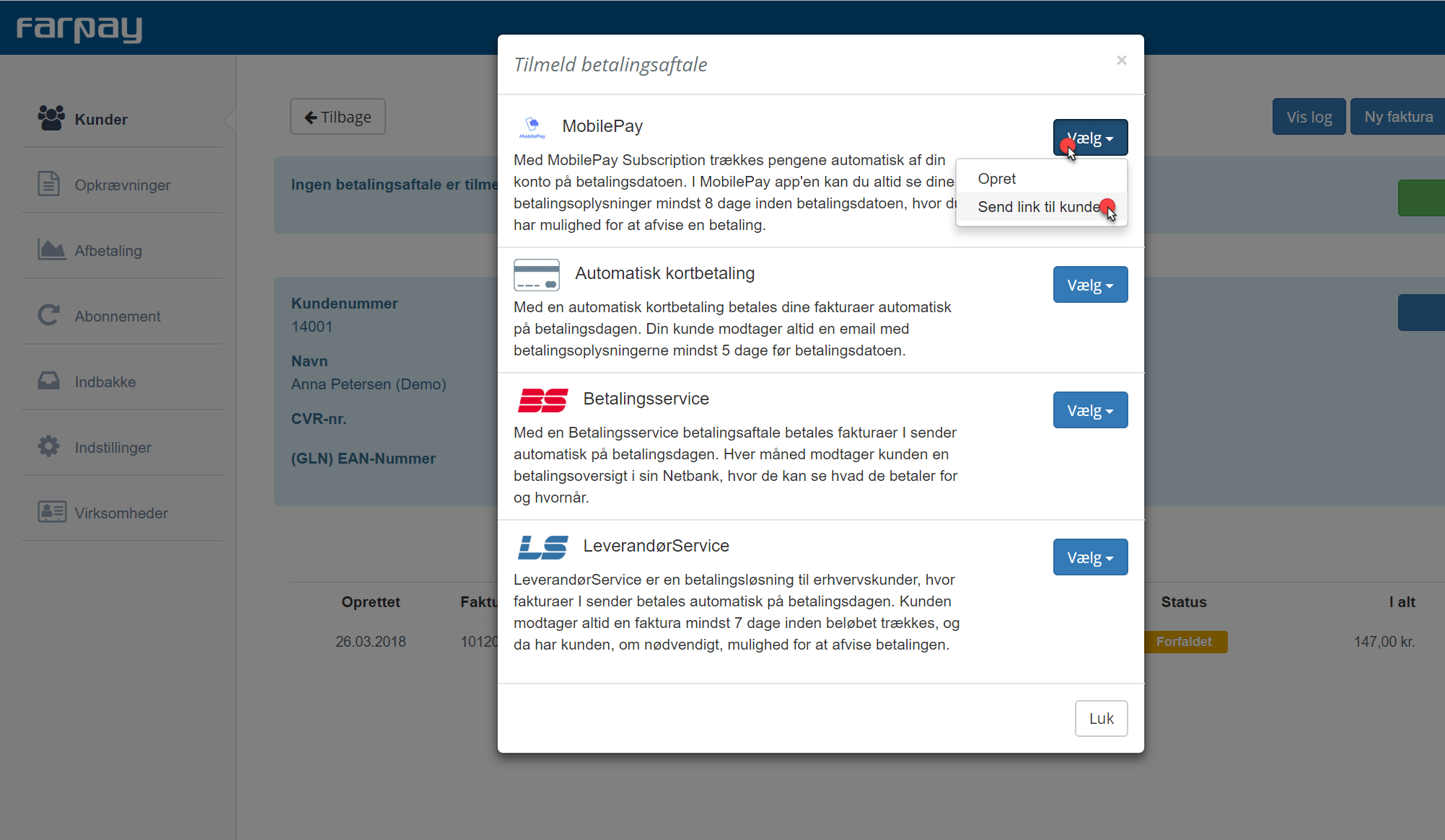 FarPay integreres som en naturlig del af e-conomic, og sender automatisk dine fakturaer til kunden. Du kan løbende følge med om fakturaen bliver læst, betalt, kunden tilmelder sig betalingsaftale m.m. FarPay tilbyder følgende betalingsløsninger: Betalingsservice, Leverandørservice, MobilePay Subscriptions, MobilePay Invoice, FI-Kreditor (+71), Kortbetaling (Dankort, VISA, Mastercard osv.). Med MobilePay Invoice eller kortbetalinger kan en faktura betales online med det samme. Og endnu smartere er, at med MobilePay Subscriptions, automatiske kortbetalinger, Leverandørservice eller Betalingsservice, kan kunderne oprette en automatisk betalingsaftale, så fremtidige fakturaer bliver betalt automatisk. Så snart kunden har betalt fakturaen, leverer FarPay indbetalingen direkte ind i din kassekladde - klar til bogføring. Alt dette foregår helt automatisk, uden at du skal foretage dig noget som helst. FarPay hjælper dig med vejledning og rådgivning når du skal oprette betalingsaftaler hos MobilePay, Nets eller en kortindløser.