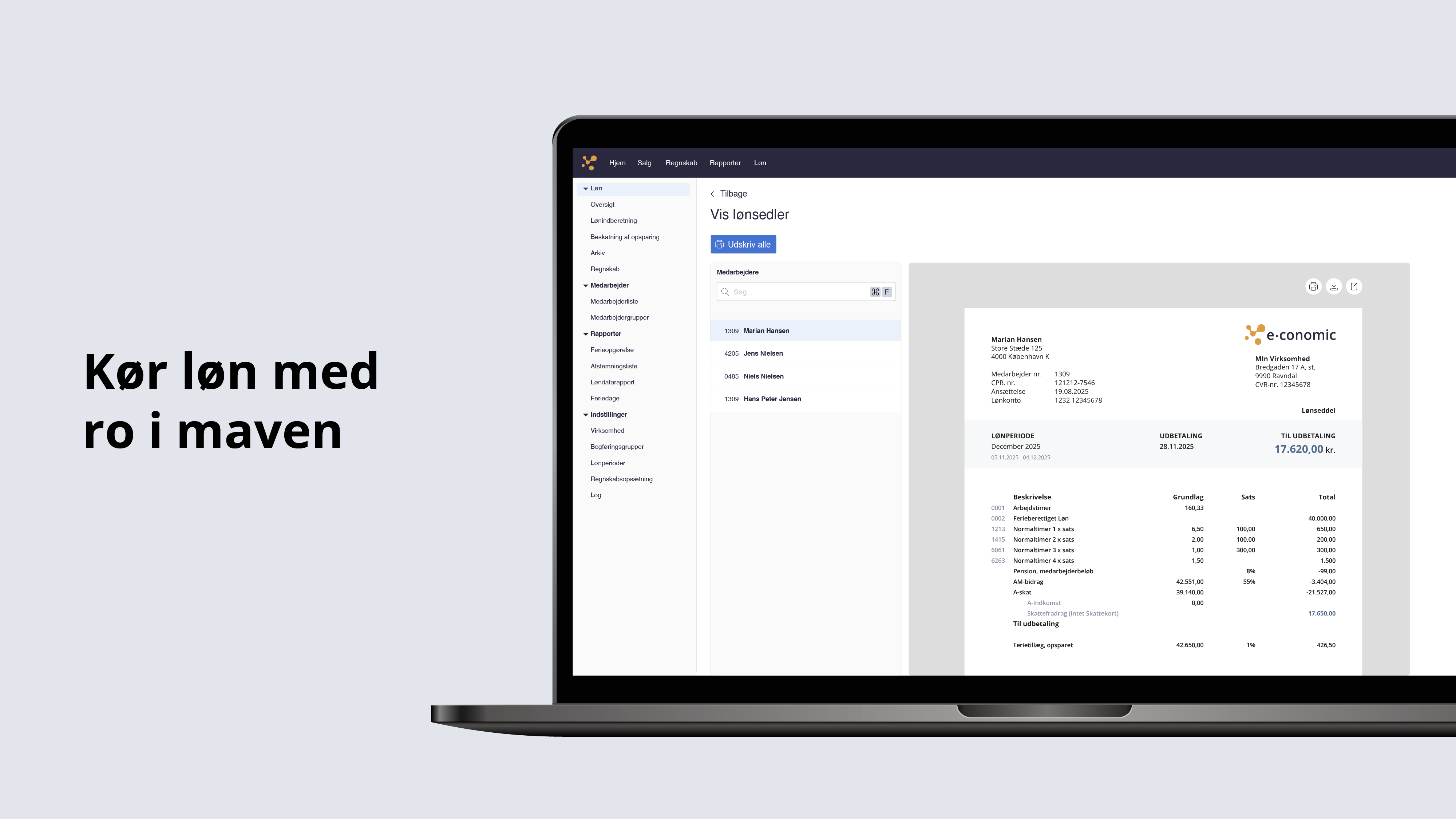 Løn er en selvstændig løsning i e-conomic med sin egen brugerflade, onboarding og support. Den bygger på den stabile motor fra DataLøn og kombinerer driftssikkerhed med e-conomics velkendte brugervenlighed.