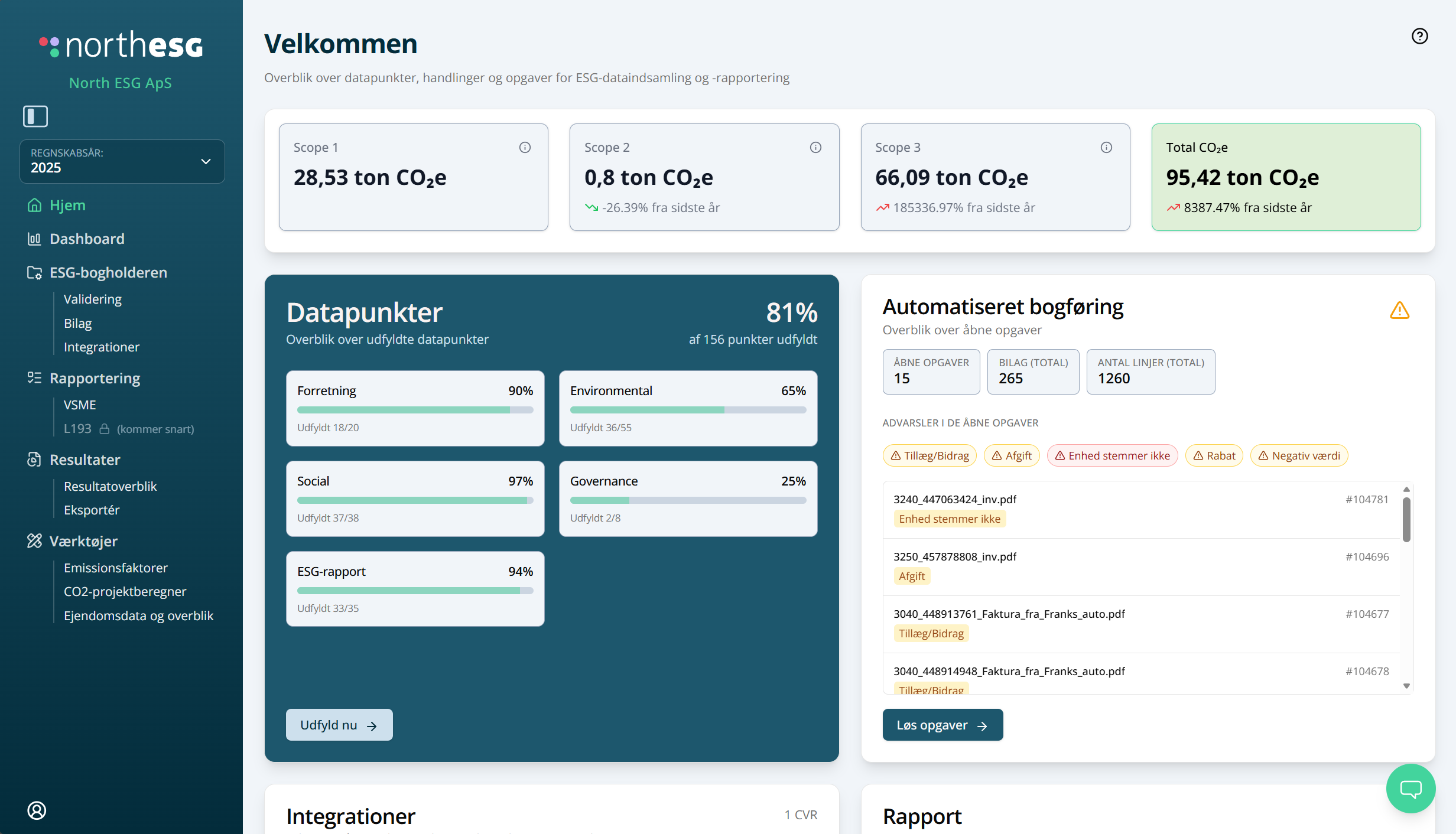 - Automatisk CO₂-regnskab (Scope 1, 2 og 3)