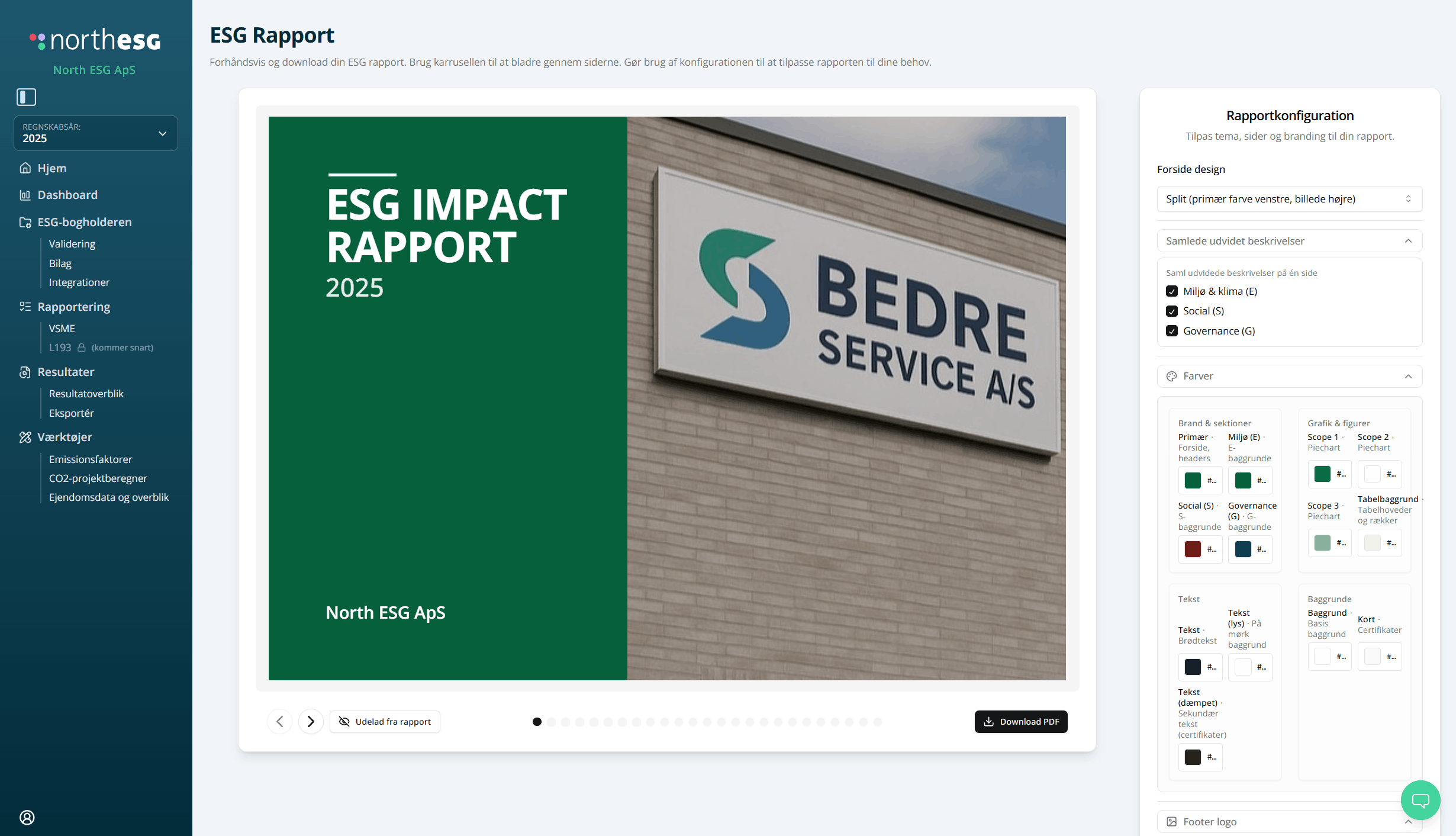 North ESG er en ESG-regnskabsplatform, der gør det muligt for virksomheder automatisk at indsamle ESG-data, beregne CO₂-udledning og generere professionelle ESG-rapporter. Med integration til virksomhedens økonomisystem og offentlige datakilder, indsamler platformen automatisk relevante data og samler dem ét sted. Dermed bliver ESG-rapportering en løbende og selvkørende proces, som gør det nemt at dokumentere virksomhedens ESG-arbejde over for kunder, banker og samarbejdspartnere.