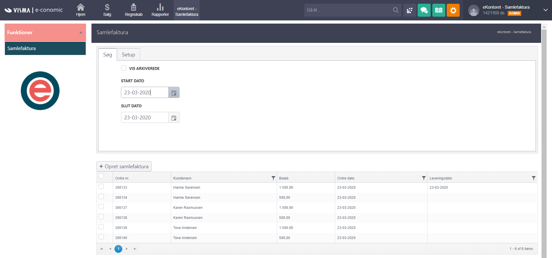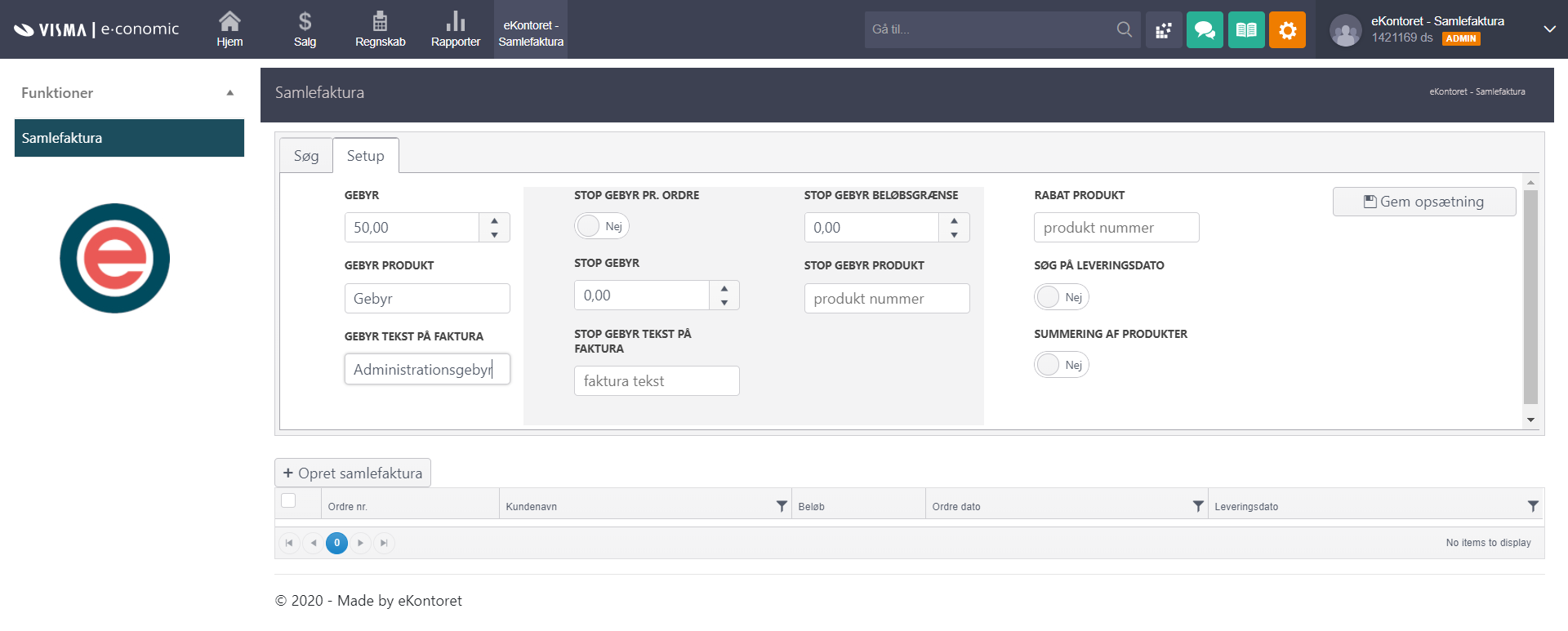 Saml hurtigt og nemt flere ordrer i én faktura og få dem tilpasset automatisk, så de afspejler din forretningsmodel. eKontorets Samlefaktura er en smart og fleksibel løsning, der giver dig fuld kontrol over dine samlefakturaer. Du kan tilføje gebyrer, gebyrer for ordrestørrelse, rabatter for individuelle kunder og få det hele til at køre automatisk, når du samler dine fakturaer. Du kan samle fakturaer for én eller flere kunder ad gangen, gruppere dem efter afdeling, dato, reference, for både eksisterende og arkiverede ordrer. Med eKontorets Samlefaktura får du en smart og professionel løsning, der gør faktureringen smartere, hurtigere og tilpasset dine behov. Undgå fejl og dobbeltarbejde og få mere tid til din kerneforretning.