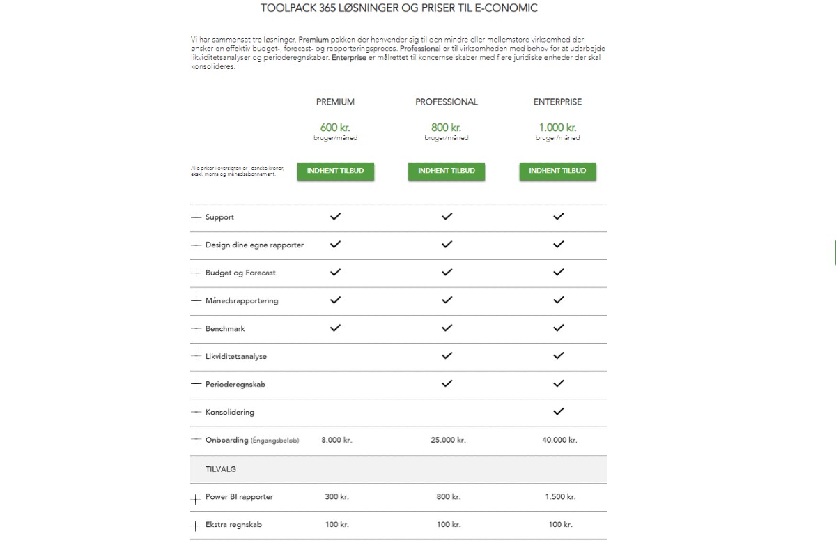 Er du træt af at bruge din tid på manuelle processer ved indsamling af e-conomic data? Og kan du forestille dig, at du ikke mere skal bruge tid på udtræk, upload og validering af data? TOOLPACK 365 indeholder færdige Power BI rapporter klar til analyse på e-conomic finans- og salgsdata. Abonnement starter fra 300 kr./ pr. bruger pr. md. og der er gratis onboarding på startpakken. Løsningen kræver Power BI pro fra Microsoft. Udover vores startpakke, har Toolpack sammensat tre løsninger: PREMIUM pakken der henvender sig til den mindre eller mellemstore virksomhed der ønsker en effektiv budget-, forecast- og rapporteringsproces. PROFESSIONAL er til virksomheden med behov for at udarbejde likviditetsanalyser og perioderegnskaber. ENTERPRISE er målrettet til koncernselskaber med flere juridiske enheder der skal konsolideres.