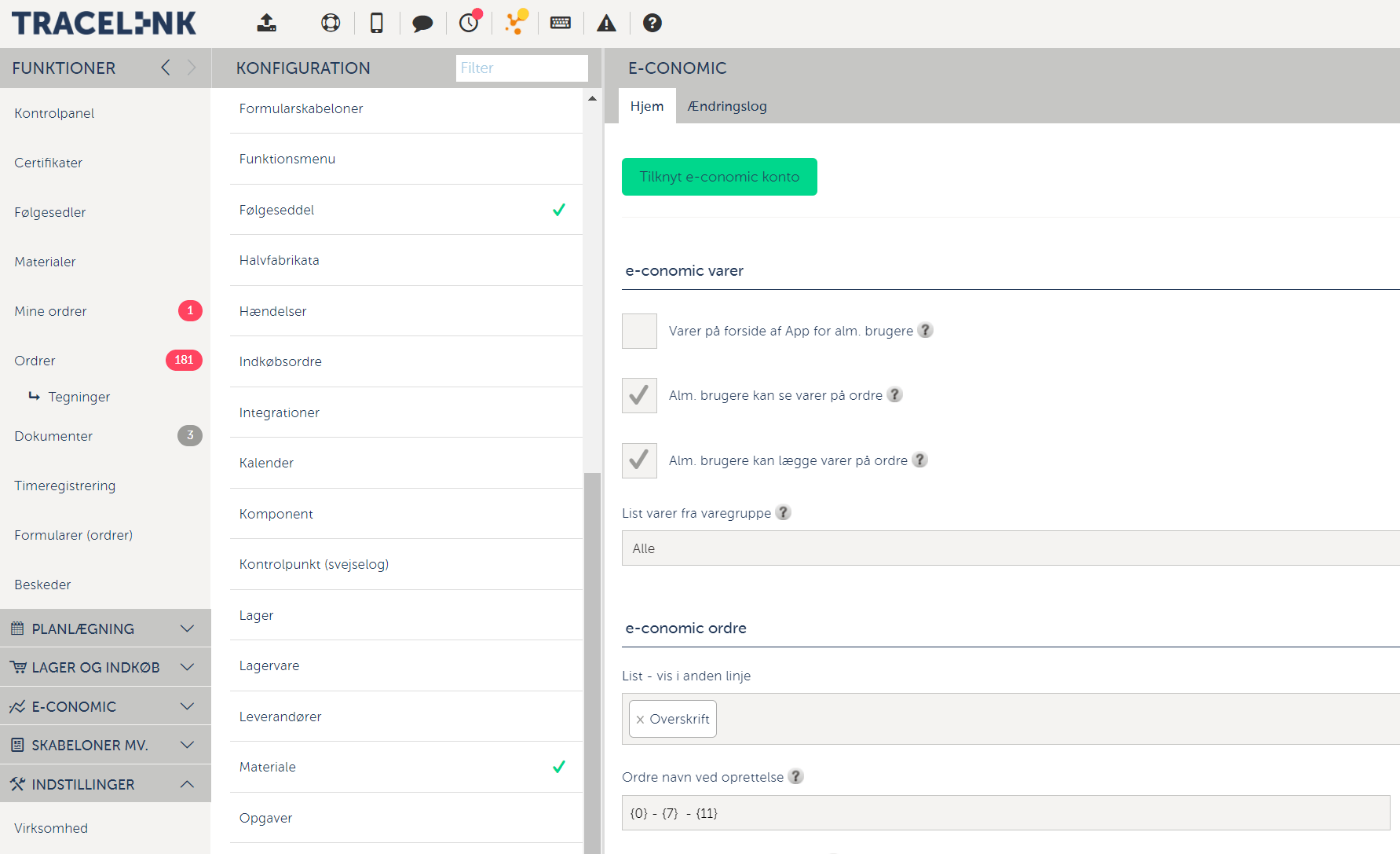 Tracelink er et IT-system til effektiv produktionsstyring. Med Tracelink kan I planlægge og løbende følge en ordres vej gennem virksomheden. Systemet gør det muligt at holde styr på, om arbejdet på ordren følger budgettet, og det er nemt at spotte ordrer, der afviger fra planen. De indbyggede funktioner gør det enkelt at registrere medarbejdernes forbrug af timer, maskiner og materialer, samt den anvendte fremgangsmåde. I får således bedre muligheder for at se og udnytte jeres ledige kapacitet. I kan samtidig dokumentere jeres produktionsplanlægning ved hjælp af ordrer-, lager- og indkøbsmoduler. I bestemmer selv, hvilke aspekter af produktionen I ønsker at dokumentere, da Tracelink er modulopbygget og kan tilpasses den enkelte virksomheds behov. Tracelink kan bruges af produktionslederen, men er også designet til anvendelse ude på gulvet i produktionen. I åbner blot Tracelink i en webbrowser eller downloader Tracelinks mobil-app. Ordrer oprettes direkte i Tracelink eller kan importeres ved integration til e-conomic. Tracelink er fuldt integreret med e-conomic, så I med et enkelt klik kan fakturere kunden, så snart arbejdet på en ordre er afsluttet. Tracelinks håndbogsmodul kan ISO certificere. Som led i en virksomheds kvalitetssikring anvendes beskrevne processer/metoder i form af procedurer, instruktioner eller procesdiagrammer. Tracelink understøtter styring af de beskrevne dokumenter f.eks. i forbindelse med en certificeringsproces.
