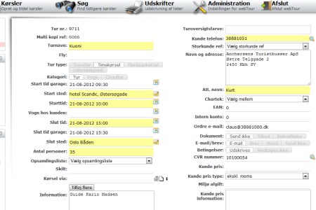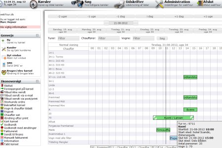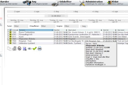 webTour er et effektivt webbaseret disponeringsværktøj til transportbranchen, der giver et godt overblik for Mini- og Turistbusser, Limousiner, Cargo og disses chauffører. Med webTour bliver det lettere at holde styr på virksomhedens drift, lige fra modtagelse af en kundeforespørgsel til tilbud, specielle ønsker til turen, færgebilletter, broafgifter, selve kørslen og den efterfølgende fakturering af kunden. Med webTour kan vognmænd og chauffører følge en kørsel fra de modtager en ordre fra en kunde og udsender tilbud, til den færdige faktura. Med webTour får du en smidigere kørselsadministration, der reducerer den tid du normalvis bruger i dag på administrative opgaver, hvilket giver en markant besparelse på virksomhedens omkostninger.