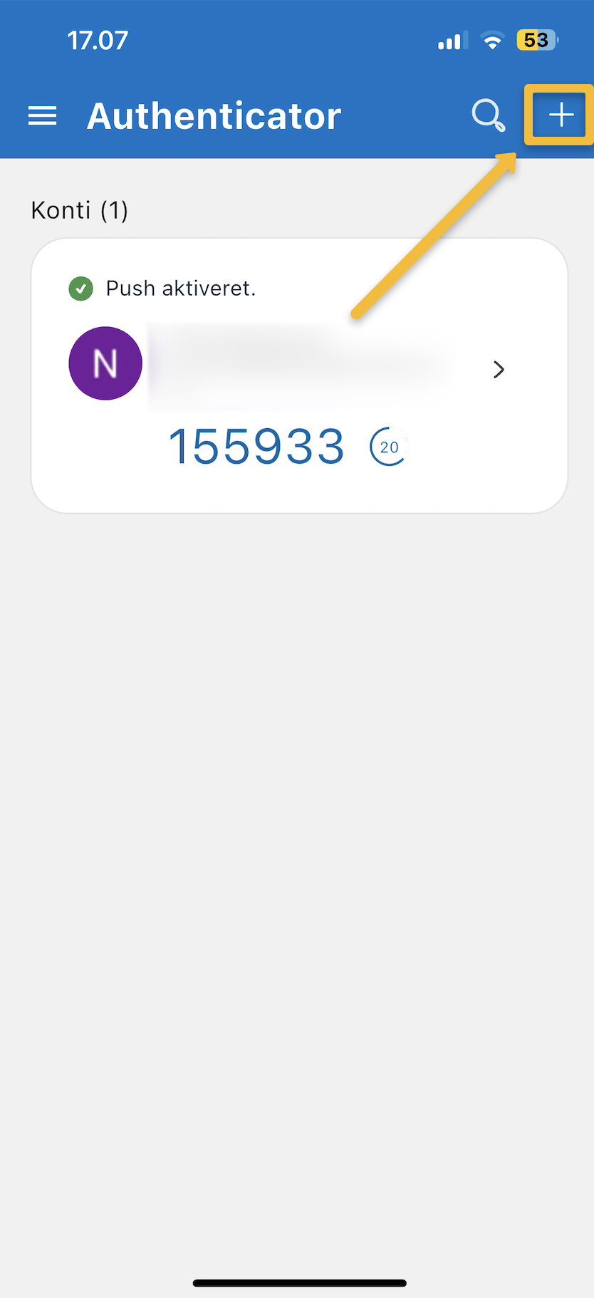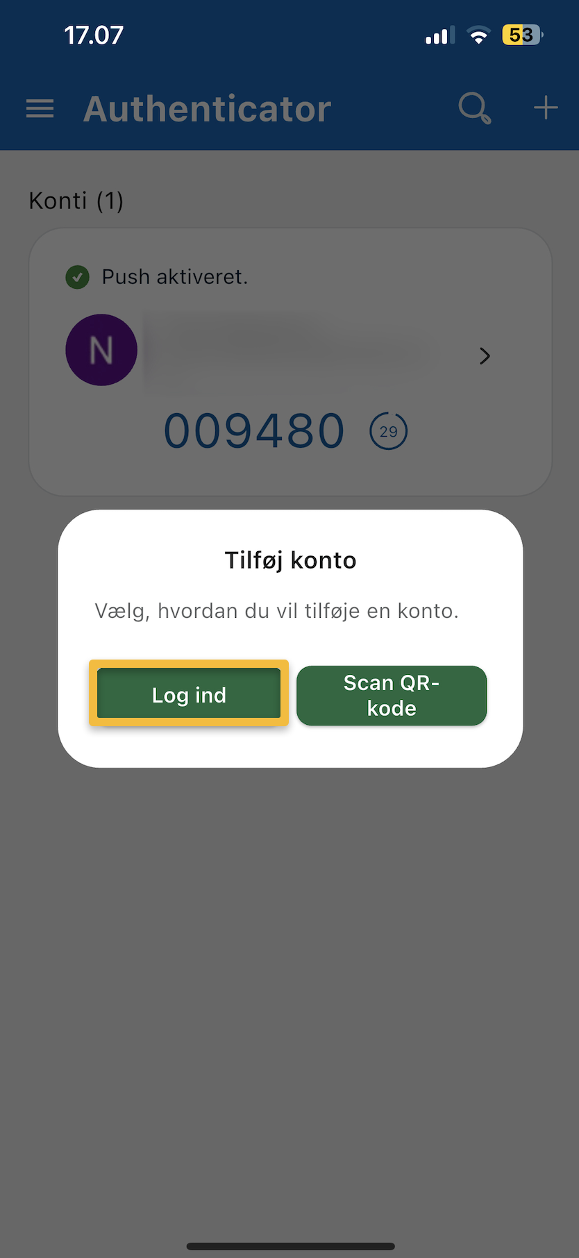 - Fortsæt nu i appen. Tryk på plusset i højre hjørne af skærmen. Du vil nu få en pop op frem hvor der står "Tilføj konto".