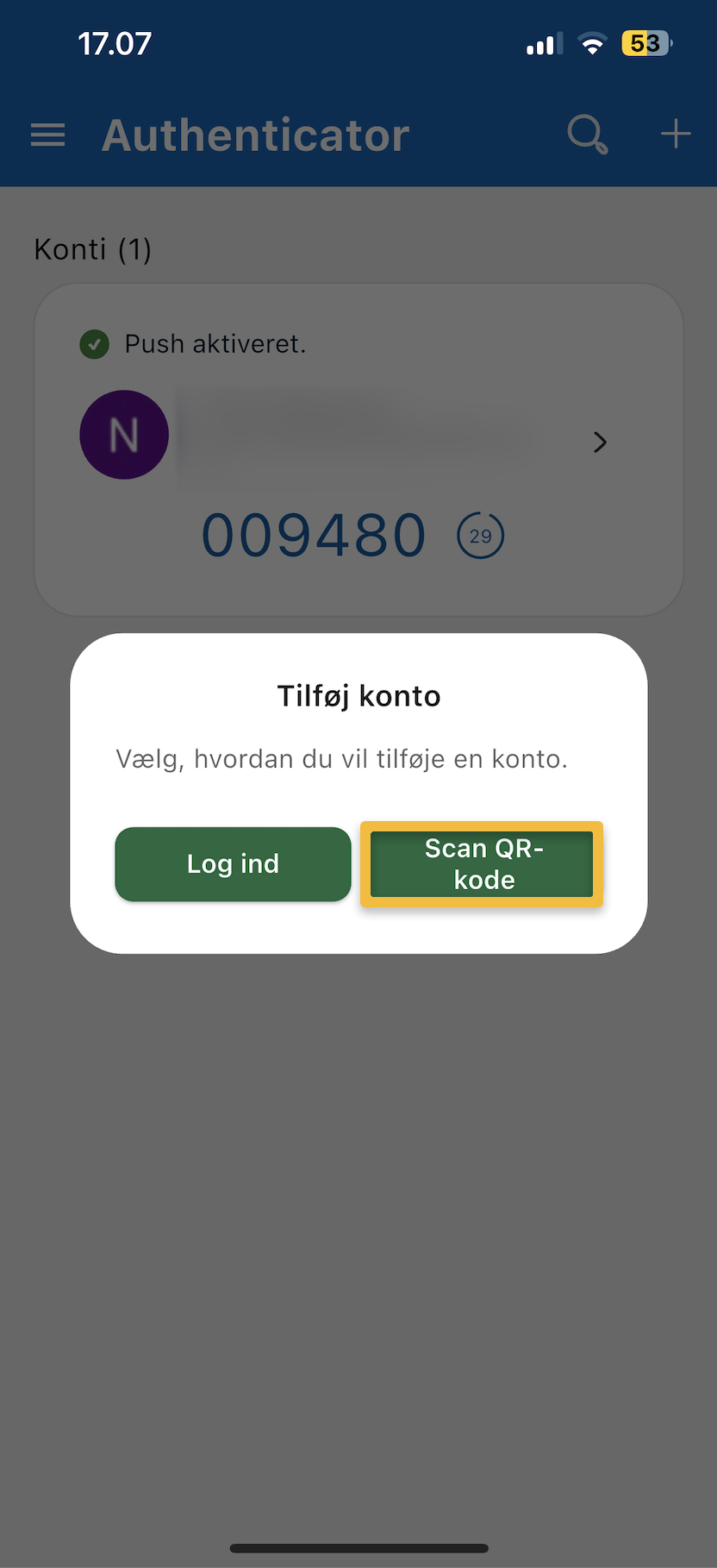 - Tryk på "Scan QR-kode" og brug din app til at skanne den QR-kode der vises på din computer.