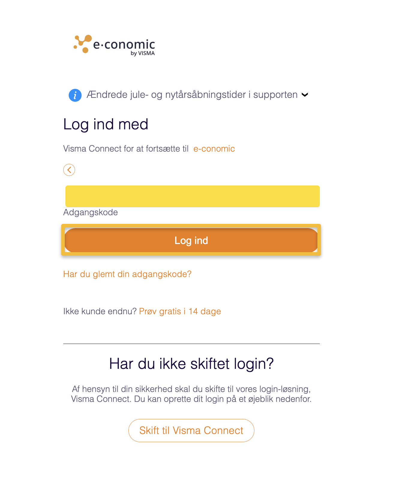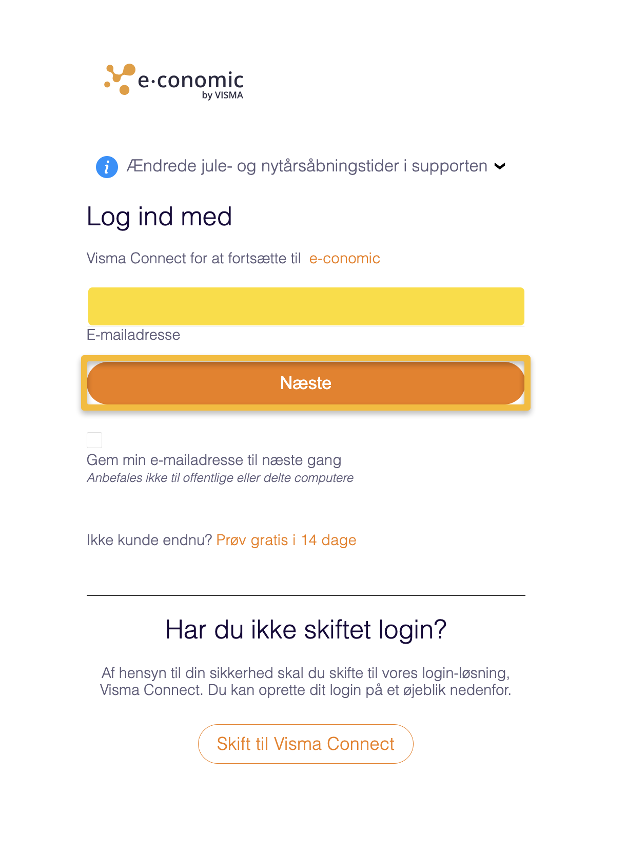 - Gå til e-conomics login-side og udfyld din mail og adgangskode som du gør når du normalt skal logge ind i e-conomic.