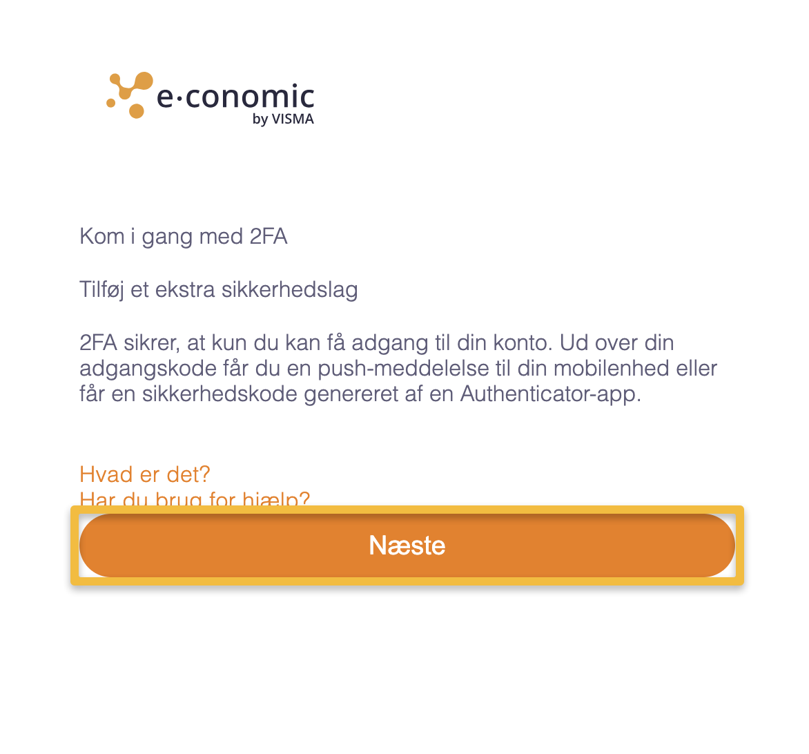 - Hvis du ikke har sat 2FA op, vil du nu mulighed for at starte opsætningen. Tryk på "Næste".