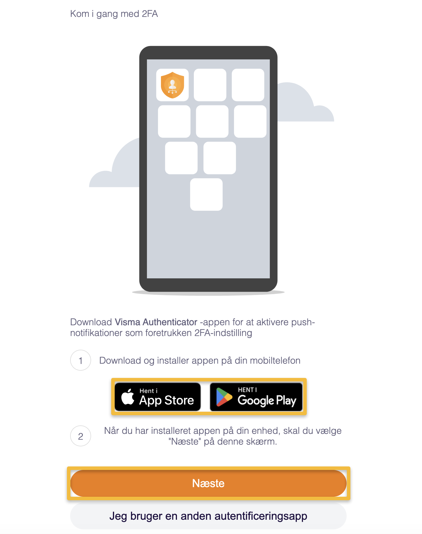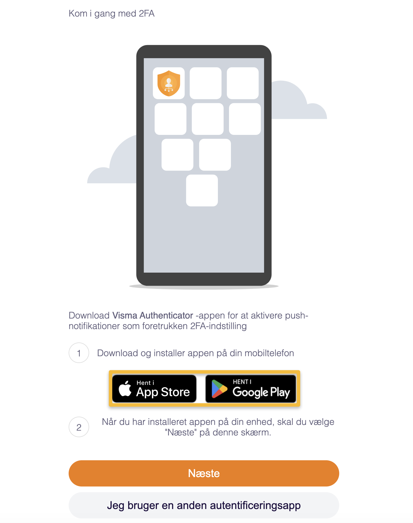 - Følg instruktionerne og download Visma Authenticator som din authentikationsapp. Tryk nu på "Næste".