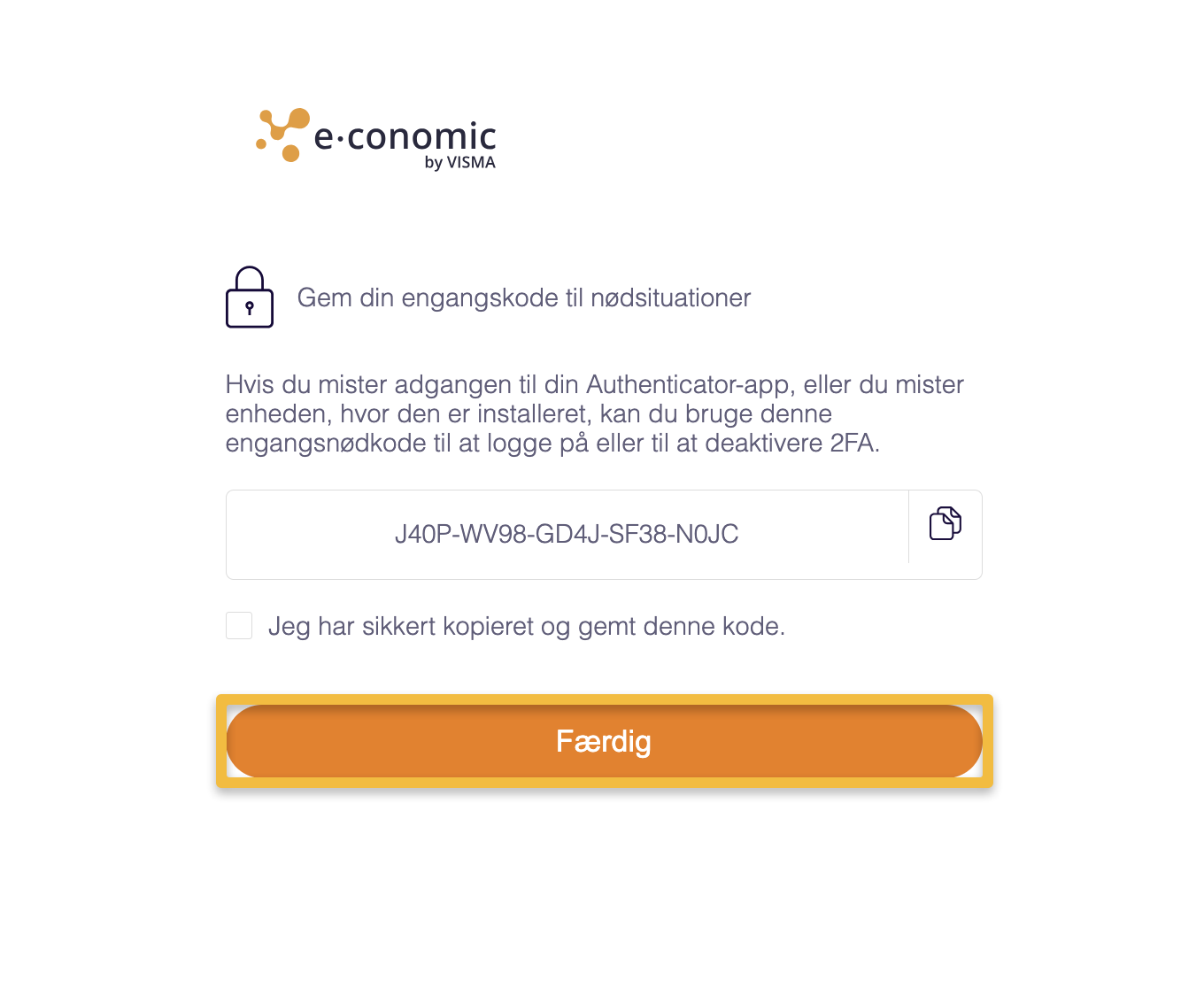 - Kopier og gem din nødkode. Denne skal bruges for at logge ind hvis du mister adgang til din telefon eller 2FA.