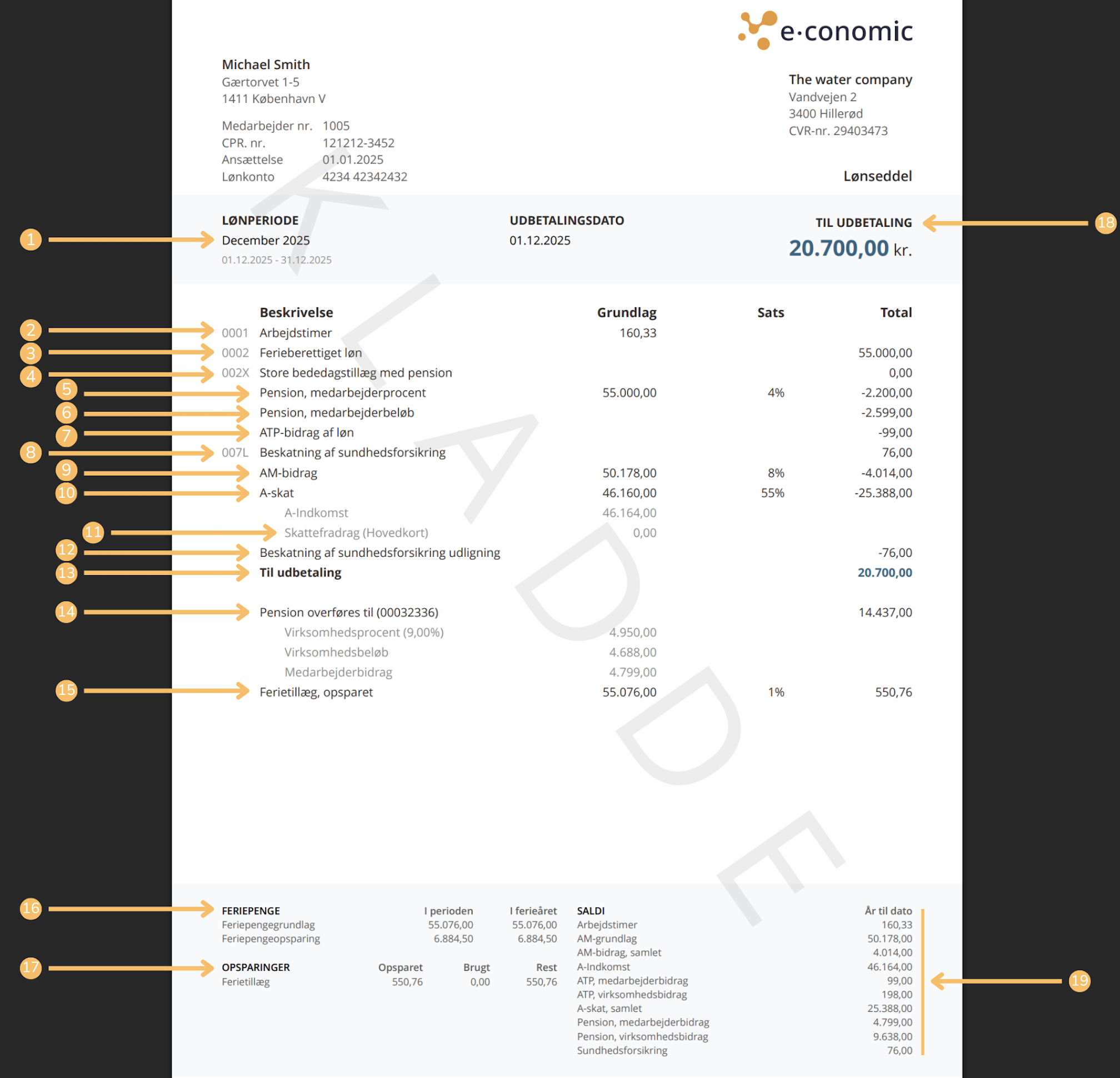 Dette er perioden, du får udbetalt løn for, og datoen, hvor lønnen er tilgængelig på din konto.