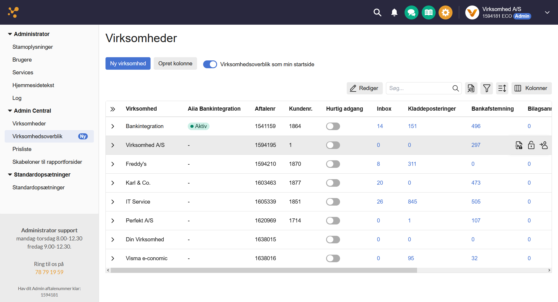 1. Tryk på "Virksomhedsoverblik" under "Admin Central" i menuen til venstre.