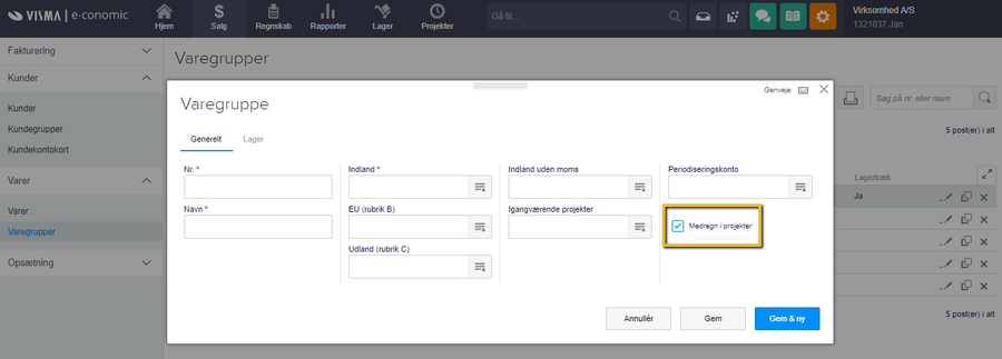 - Sæt hak i "Medregn i projekter". Udfyld de restende felter, hvis du er ved at oprettet en ny varergruppe.