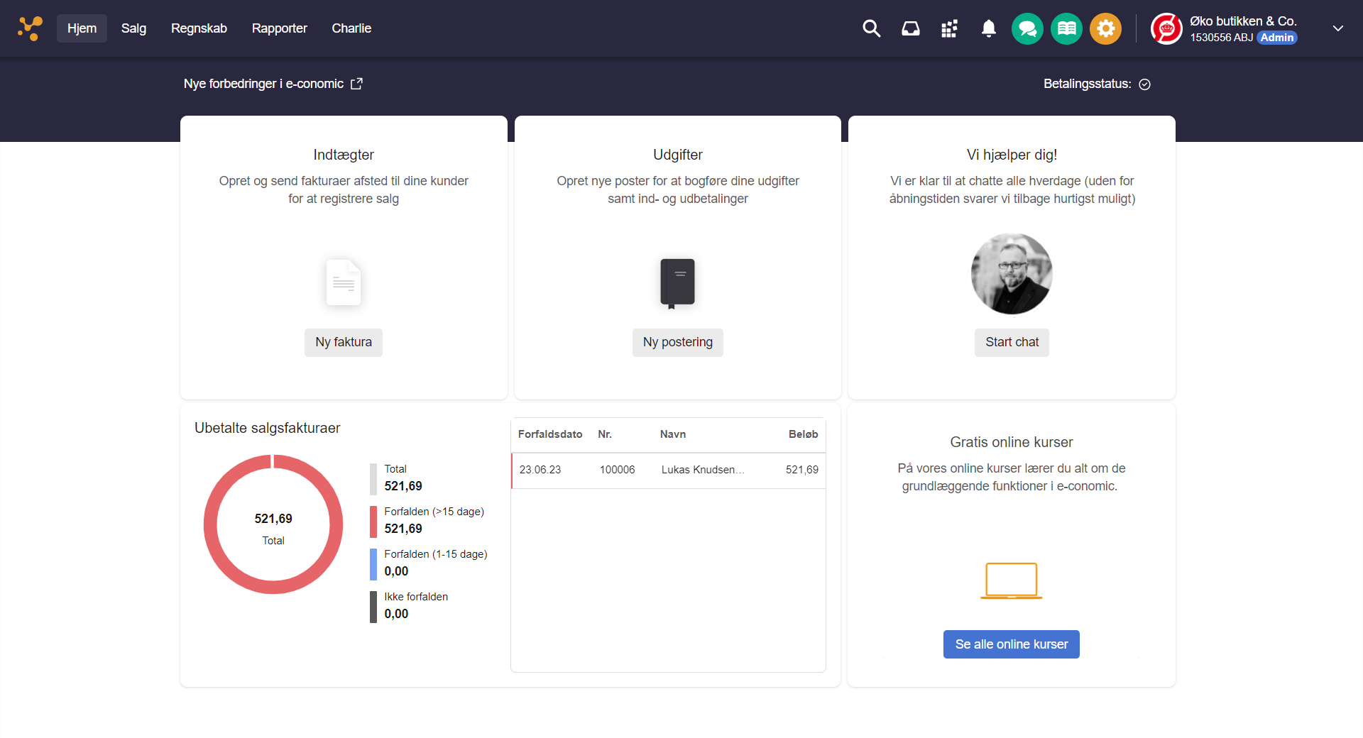 Så kan du trykke på "Start chat" i feltet øverst til højre på fanen Hjem, for at komme i kontakt med chatsupporten hos e-conomic. Alternativt, kan du altid trykke på den grønne knap med to talebobler, øverst mod højre i e-conomic for at komme i kontakt med os.