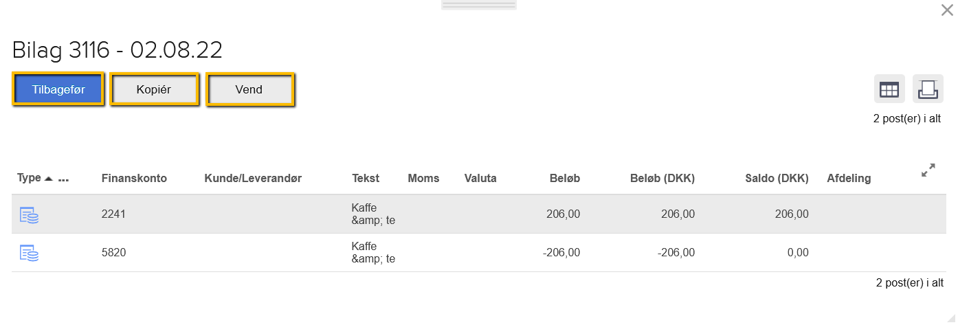Du skal være opmærksom på, at det kun er posteringer, som du oprindeligt har bogført under fanebladet "Regnskab", du kan kopiere, vende eller tilbageføre med denne funktion, såfremt dine poster ligger i et åbent regnskabsår.