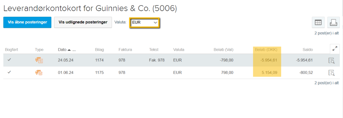 Du kan altid udregne valutakursen på dit bogførte bilag ved at dividere "Beløb (DKK)" med "Beløb (Val)" og gange med 100 for at se, hvorvidt det er den ønskede kurs som er brugt.
