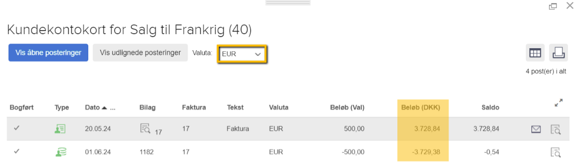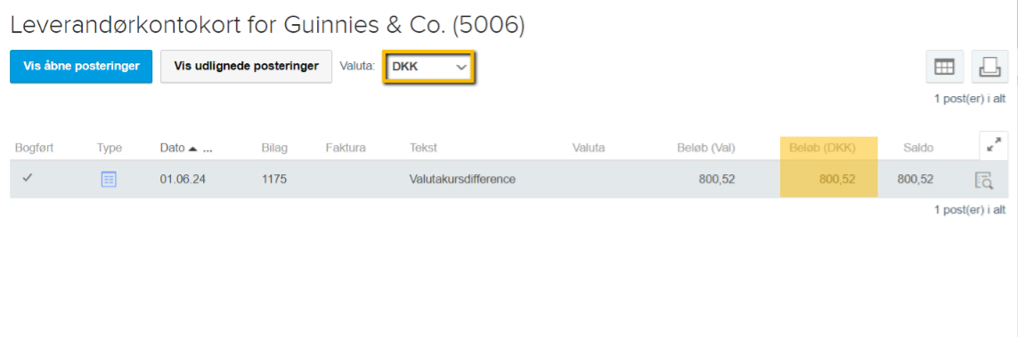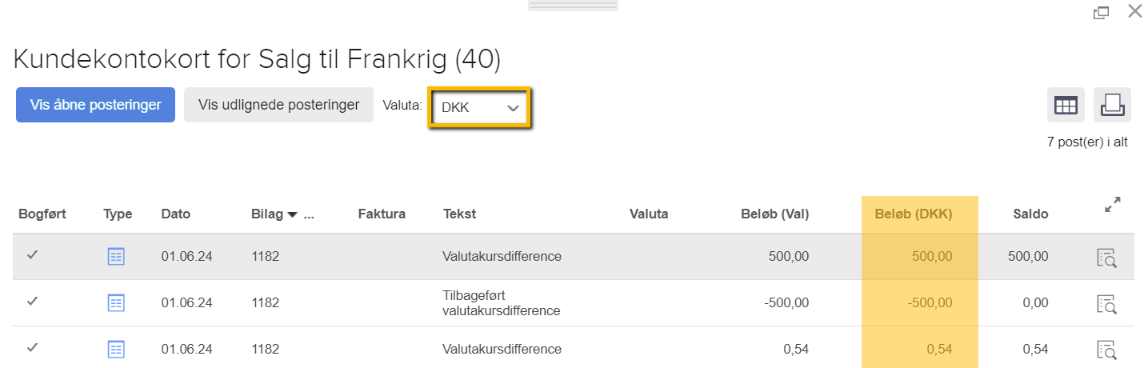 Valutadifferenceposteringer der automatisk genereres af systemet vil altid stå i grundvalutaen. De kan derfor hurtigt findes frem via kundens eller leverandørens posteringer og vil fremgå på kunde- og leverandørkontokortet.