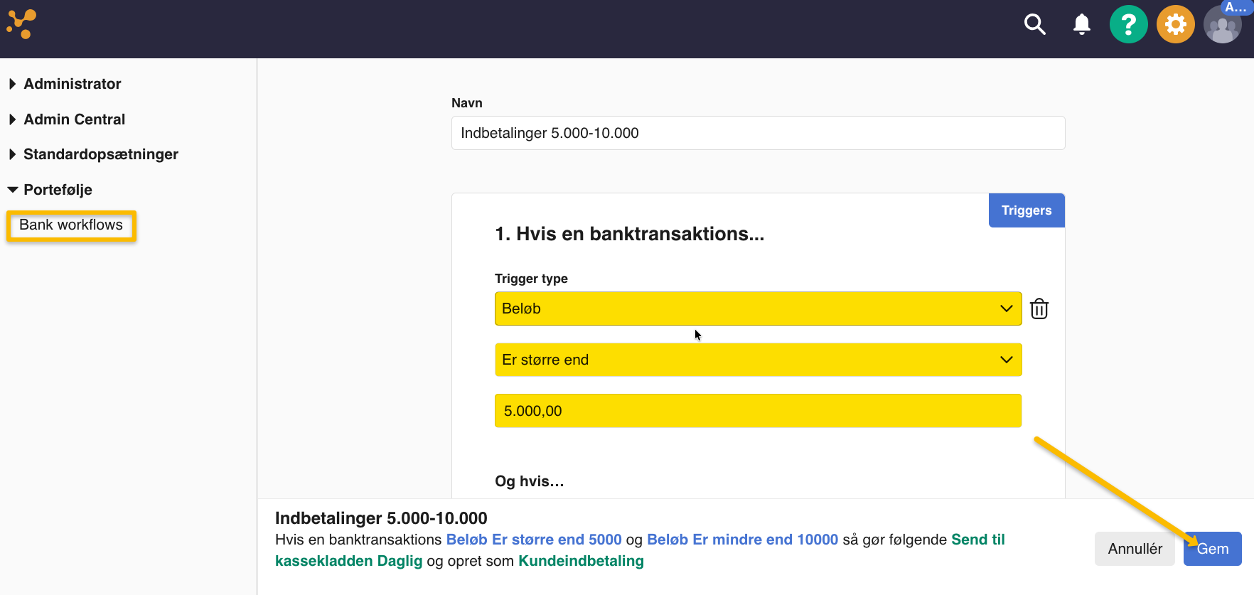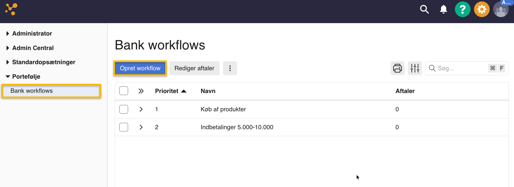 - Gå til "Portefølje" i venstre menu og vælg "Bank workflows".