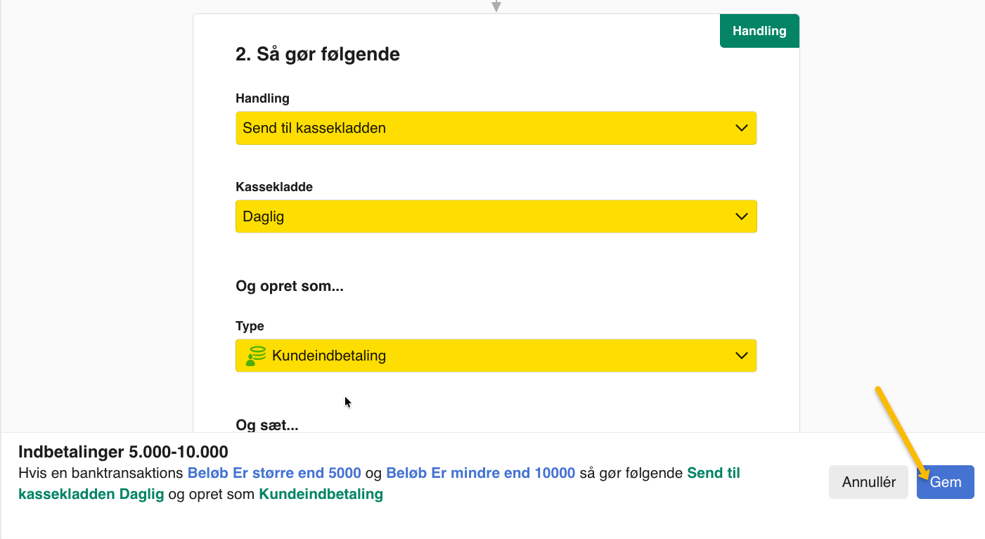 - I feltet "Handling" vælger du hvordan dit Bank Workflow skal håndtere posteringer som aktiverer den valgte trigger.
