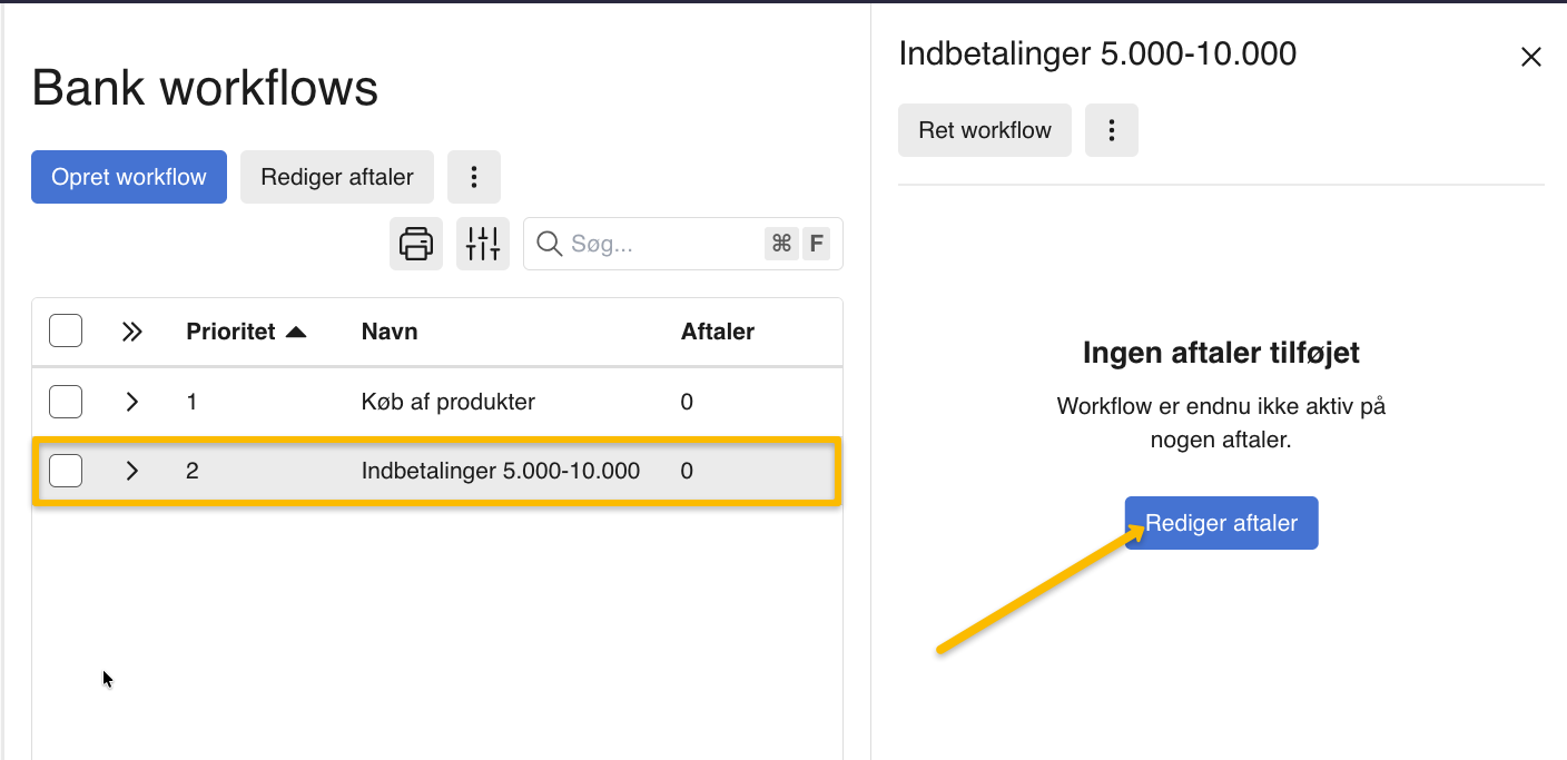 - Tryk på det Bank Workflow som du vil tilføje aftaler til.