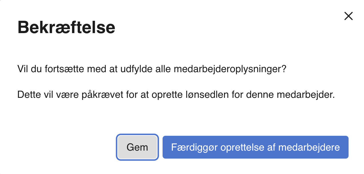 - Vælger du at gemme medarbejderen, kan du fortsætte med dennes opsætning ved at rykke på "Færdiggør oprettelse af medarbejdere" i næste vindue. Bemærk at du ikke kan lave løn for medarbejderen før hele opsætningen er gennemført.
