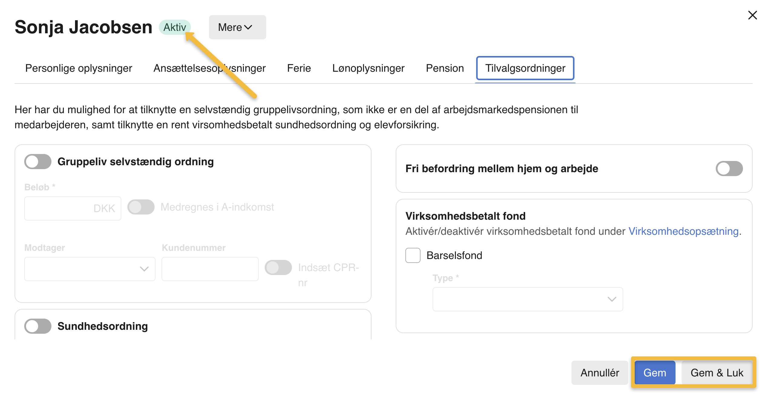 - Under fanen "Tilvalgsordninger" kan du tilføje øvrige virksomhedsordninger som medarbejderen skal være en del af.