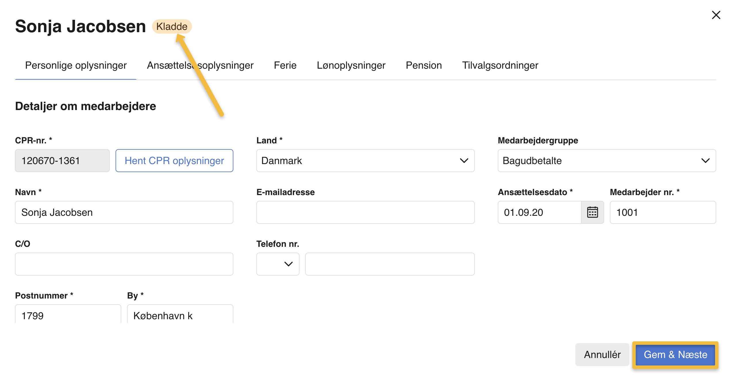 - Under den videre opsætning vil medarbejderen være markeret som "Kladde" indtil du har udfyldt alle de oplysninger som er nødvendige for at lave en lønkørsel for medarbejderen. Når de nødvendige oplysninger er udfyldte markeres medarbejderen som "Akriv".