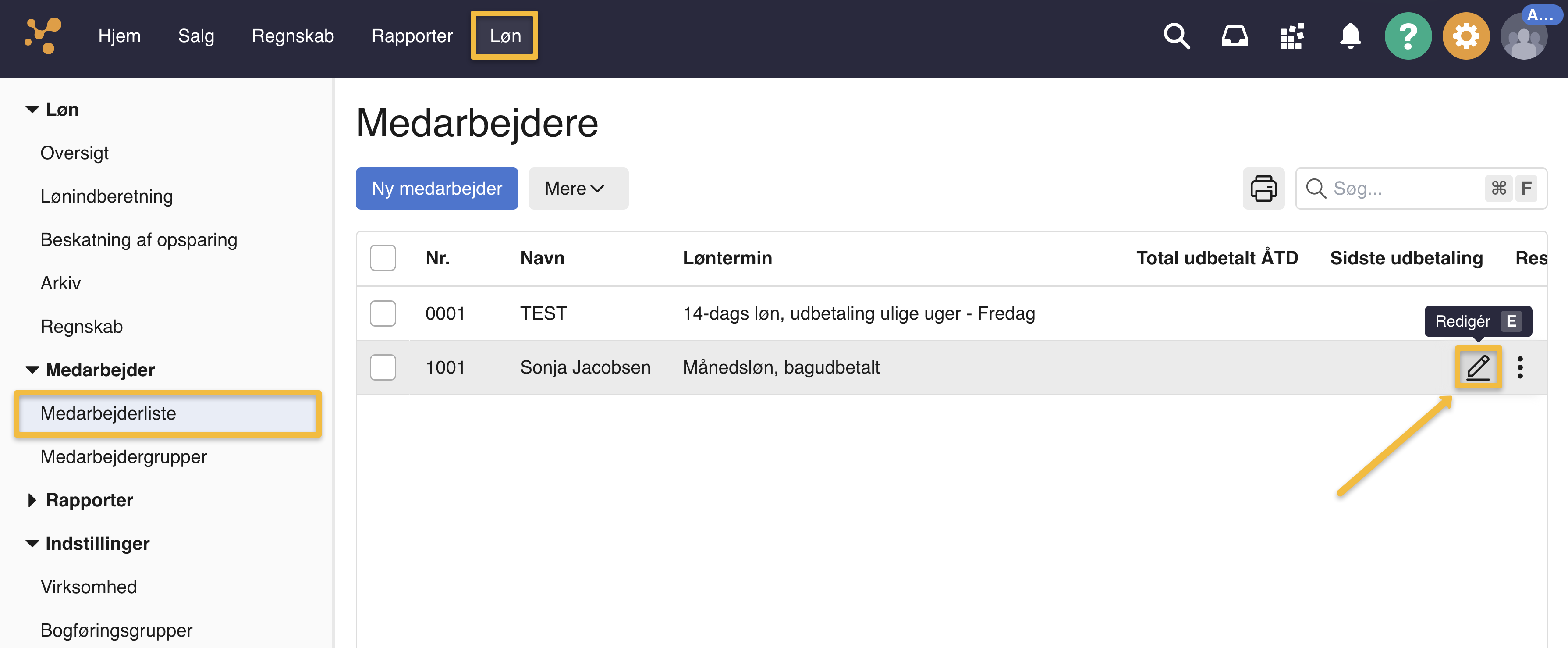 - Find den pågældende medrbejder og tryk på "Redigér" på blyanten ud for medarbejderen.