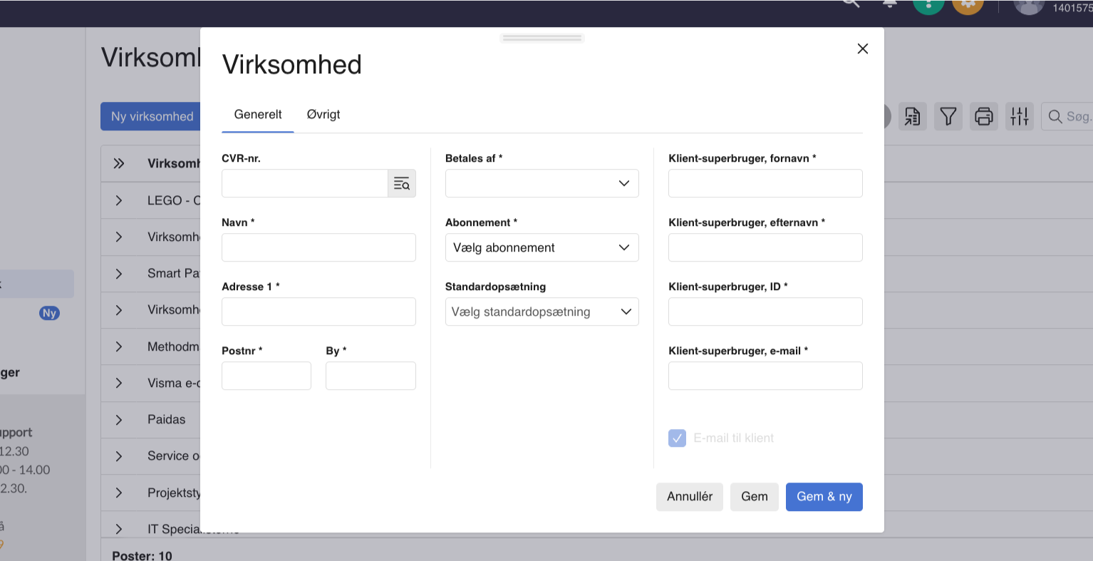 Klient-superbruger, fornavn/efternavn: Navnet på personen i den nye virksomhed, som får superbrugerrettigheder. Feltet skal kun udfyldes, hvis kunden selv skal have adgang.