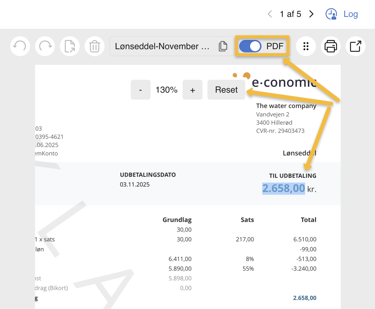 Er dit bilag i PDF-format kan du også kopiere oplysninger direkte fra bilaget, f.eks. pris, og indsætte dem direkte i felterne til venstre for dit bilag.