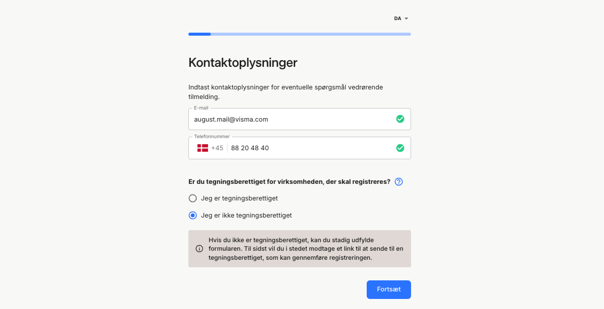 • Den udfyldes af en anden person end virksomhedens ejer: hermed kan personen udfylde virksomhedens oplysninger, og får et link, der skal videresendes til den/de tegningsberettigede for at de kan underskrive med MitID.