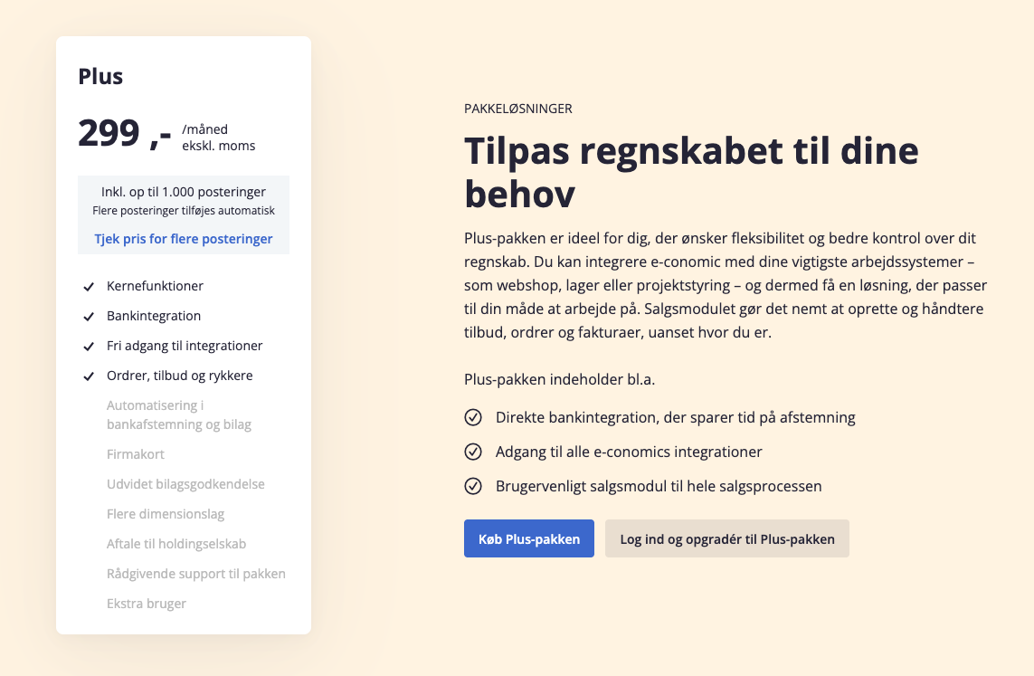 Plus er til dig som bruger flere bogføringsfunktioner og ønsker at forbinde regnskabet med andre programmer, som f.eks. dit kassesystem og webshop eller med din bank, så du automatisk får posteringer overført. Plus er også til dig, der vil bruge vores salgsmodul til fulde med mulighed for at sende tilbud, ordre og rykkere.