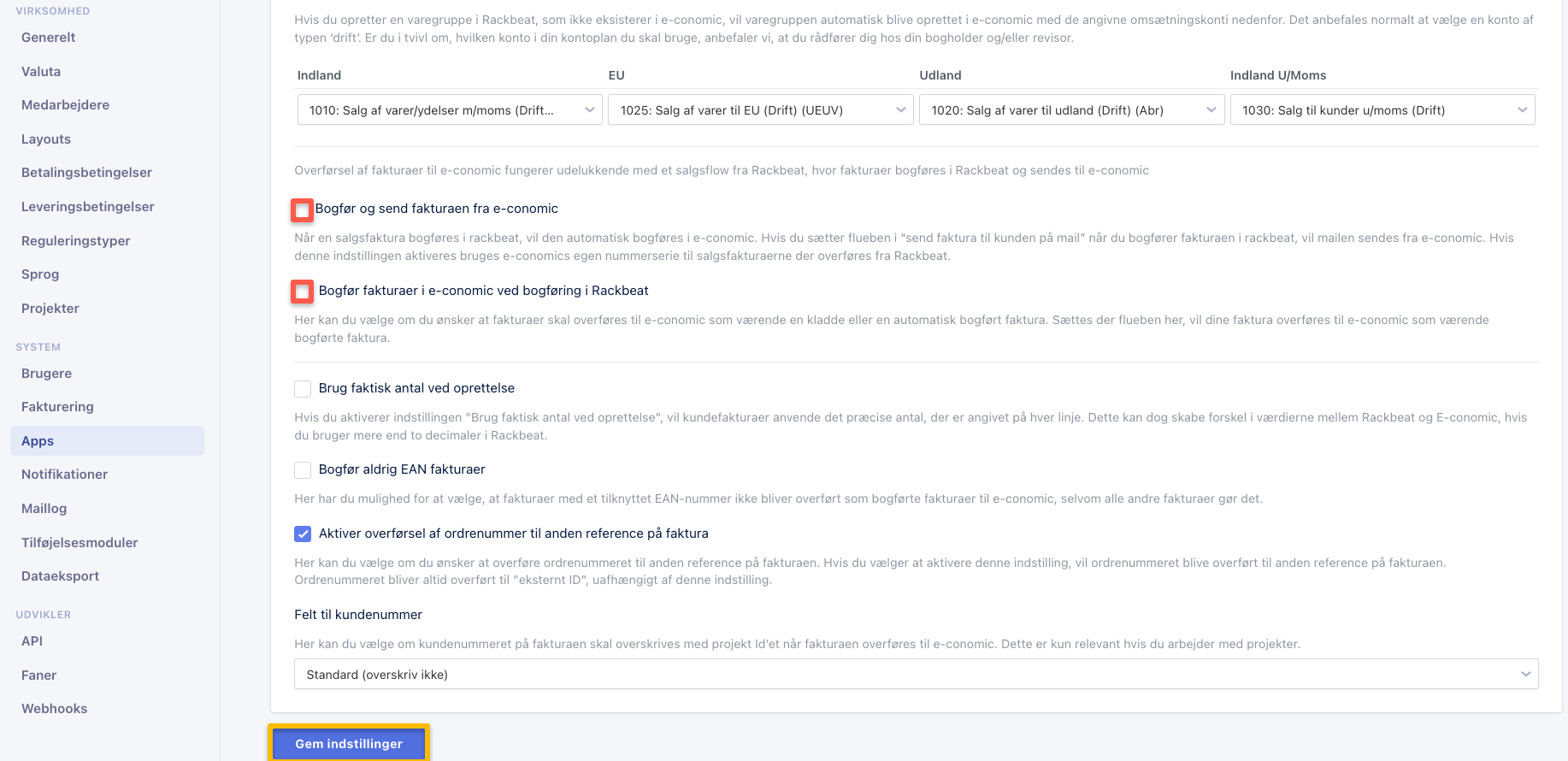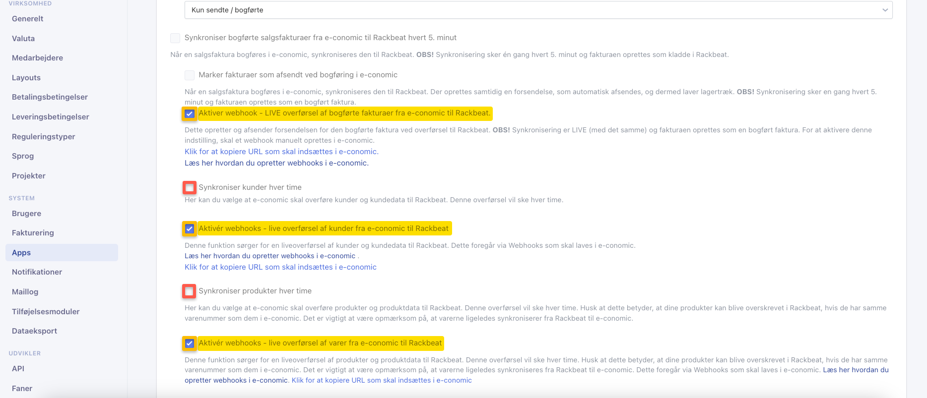 - Fjern her eventuelle flueben i "Bogfør og send fakturaen fra e-conomic" eller "Bogfør fakturaer i e-conomic ved bogføring i Rackbeat" da disse funktioner blokerer muligheden for at slå webhooks til. Tryk derefter på "Gem indstillinger".