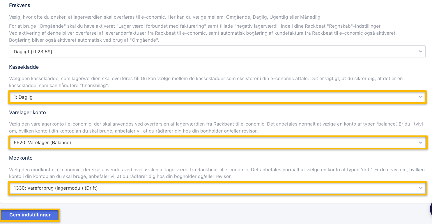 - Vælg den varelagerkonto som lagerværdien skal bogføres på i e-conomic, når den overføres fra Rackbeat. Dette vil normalt være en balancekonto