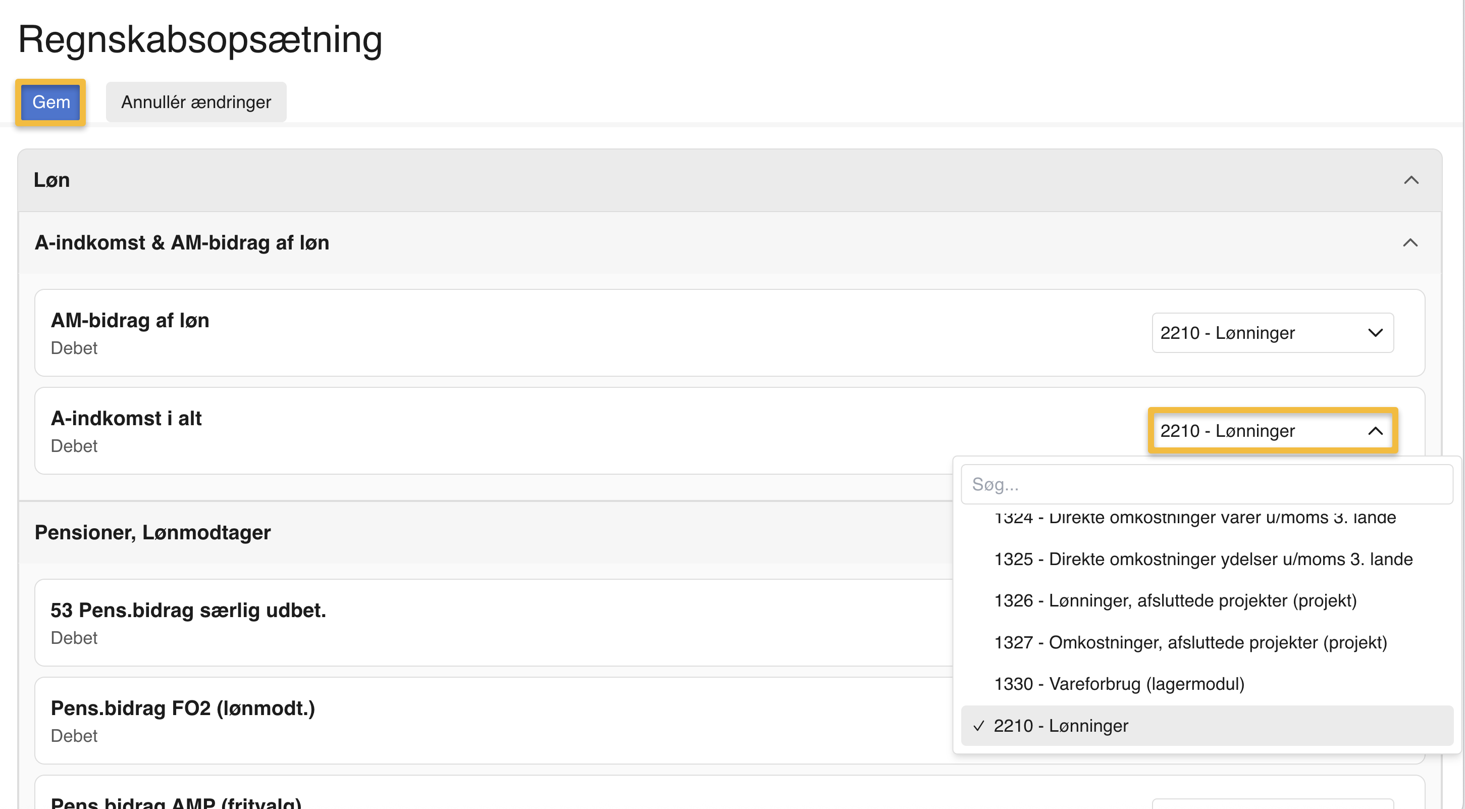 - Under "Udbetalinger" kan du angive hvilken konto forskellige udbetalinger, f.eks. ATP, skal bogføres på.