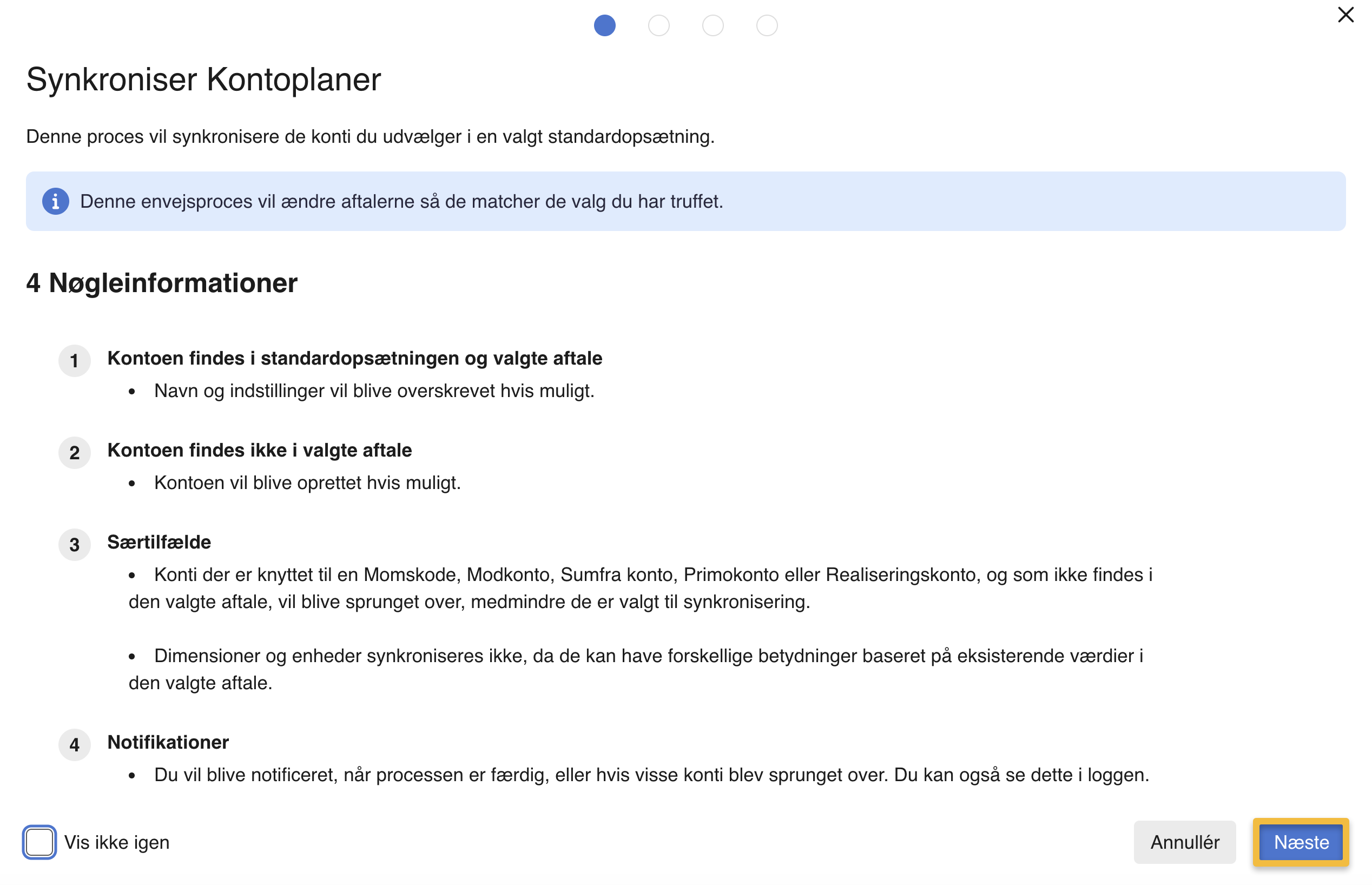 - Læs de fire mulige udfald så du er indforstået med hvaad der kommer til at ske ved samtlige konti når synkroniseringen gennemføres og tryk derefter på "Næste".