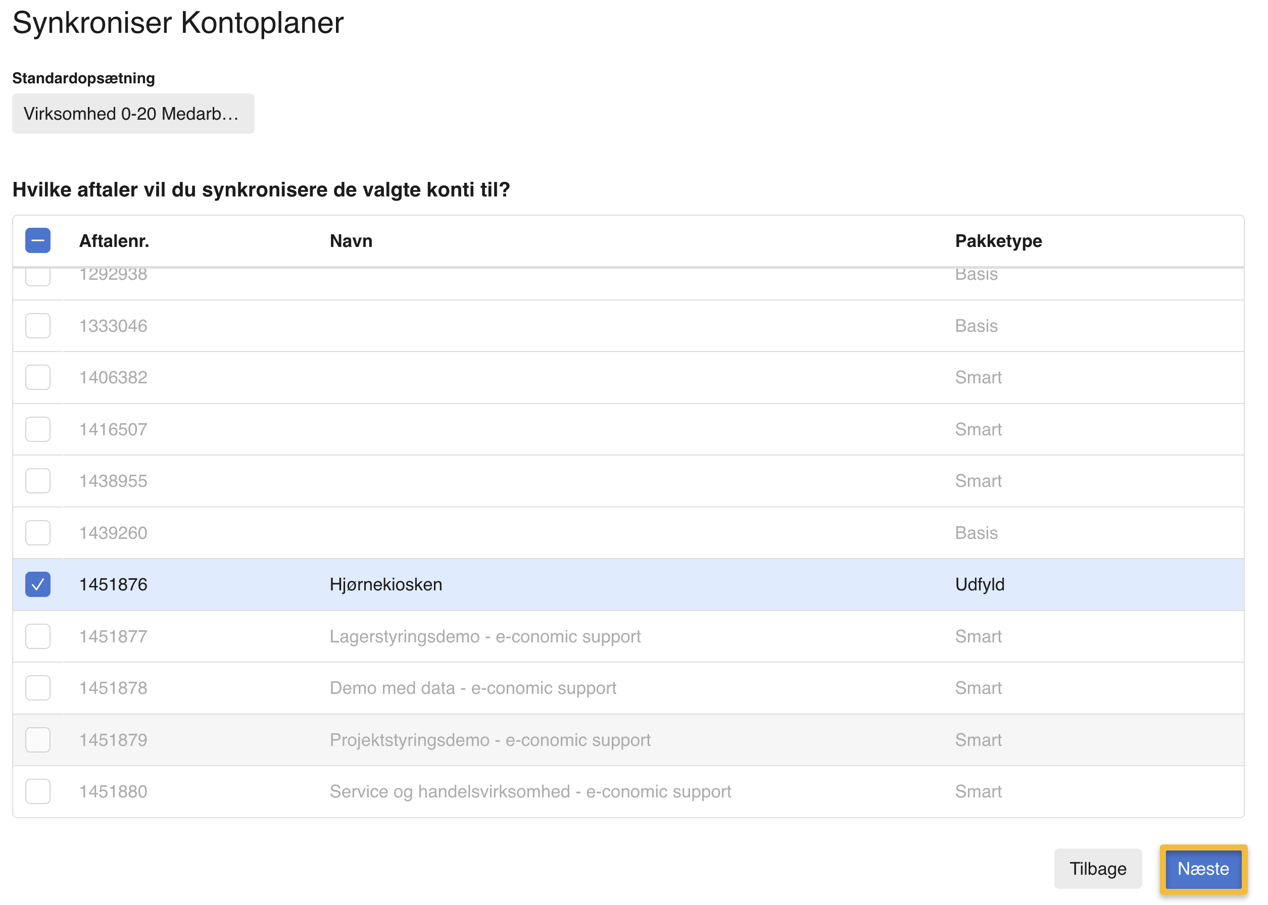 - Du vil nu kunne se din kontoplan for den valgte standardopsætning. Sæt flueben i de konti som du vil synkronisere og tryk på "Næste".