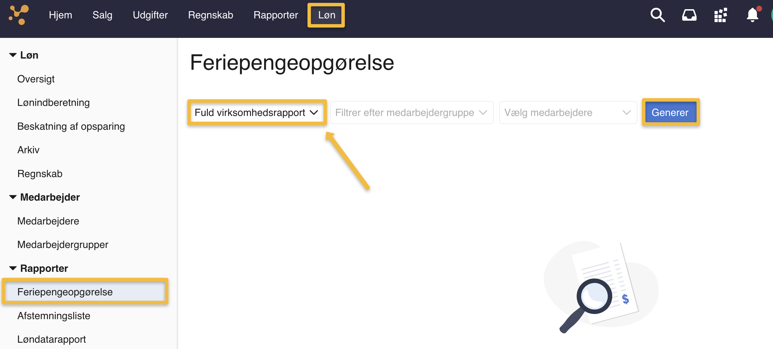 1. Gå til fanen "Løn" og vælg "Feriepengeopgørelse" under "Rapporter" i menuen til venstre.